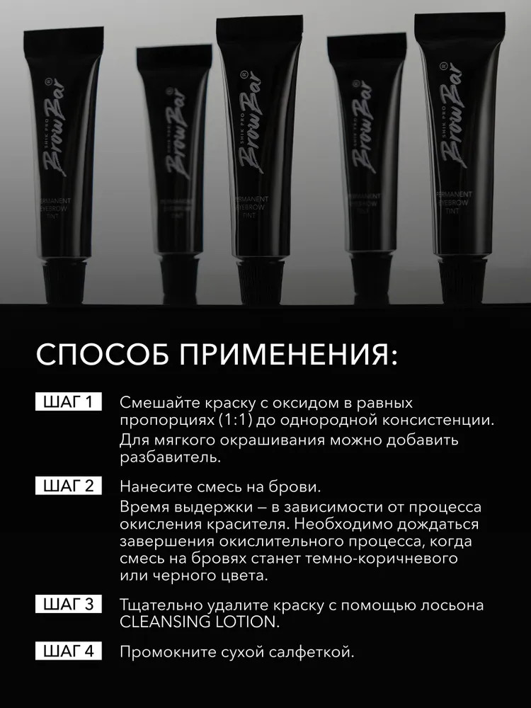 • нанесите смесь на брови. Время выдержки — в зависимости от процесса окисления красителя. Необходимо дождаться завершения окислительного процесса, когда смесь на бровях станет темно-коричневого или черного цвета;