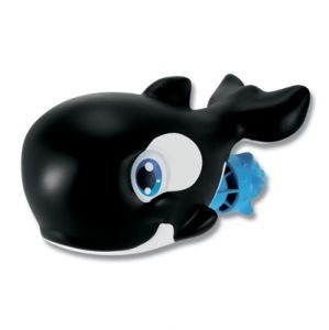 Кит может плыть на поверхности воды, или в глубине, или по кругу (в одну или другую сторону), достаточно всего лишь изменить угол наклона подвижно закреплённого винта (вверх, вниз, влево, вправо). Отключить моторчик можно обратным поворотом кожуха. На спинке Кита есть небольшое отверстие, как у настоящего. Если опустить игрушку в воду и нажать на неё, Кит выпустит фонтанчик пузырьков. А когда игрушка наполнится водой, можно вытащить её и побрызгаться – отличная брызгалка!