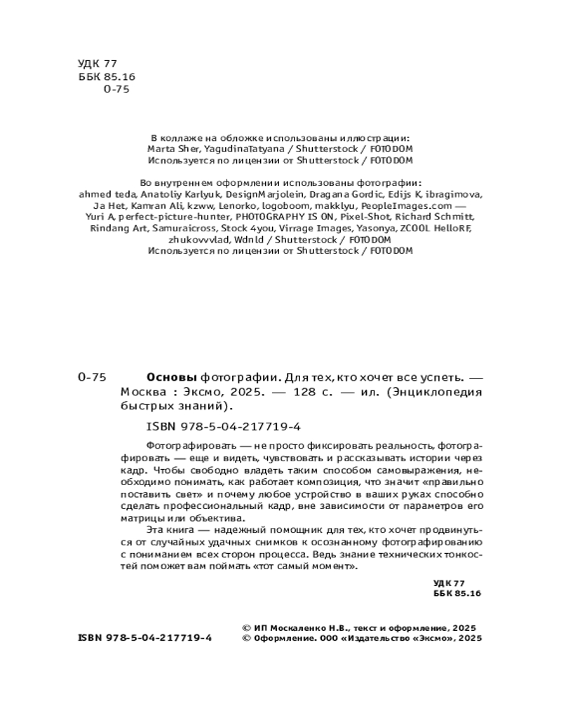 В данный момент этот товар отсутствует в продаже. Возможно, у нас найдется аналогичный или похожий товар здесь. Серия: Энциклопедия быстрых знаний (обложка) Снова засвечен снимок? Случайная тень пятном упала на лицо модели, и кадр оказался безнадежно испорчен? Из раза в раз не удается поймать фокус или добиться желаемой четкости изображений, которые при малейшей обработке начинают «шуметь»? Время освежить основы фотографии и переходить на ручной режим съемки! Эта книга поможет вам сориентироваться в бесконечных настройках камеры, расскажет о композиции и основах теории цвета, научит не бояться сложного света и ловко управляться с ГРИПом, а также раскроет тонкости жанровой фотографии и мобильной съемки.