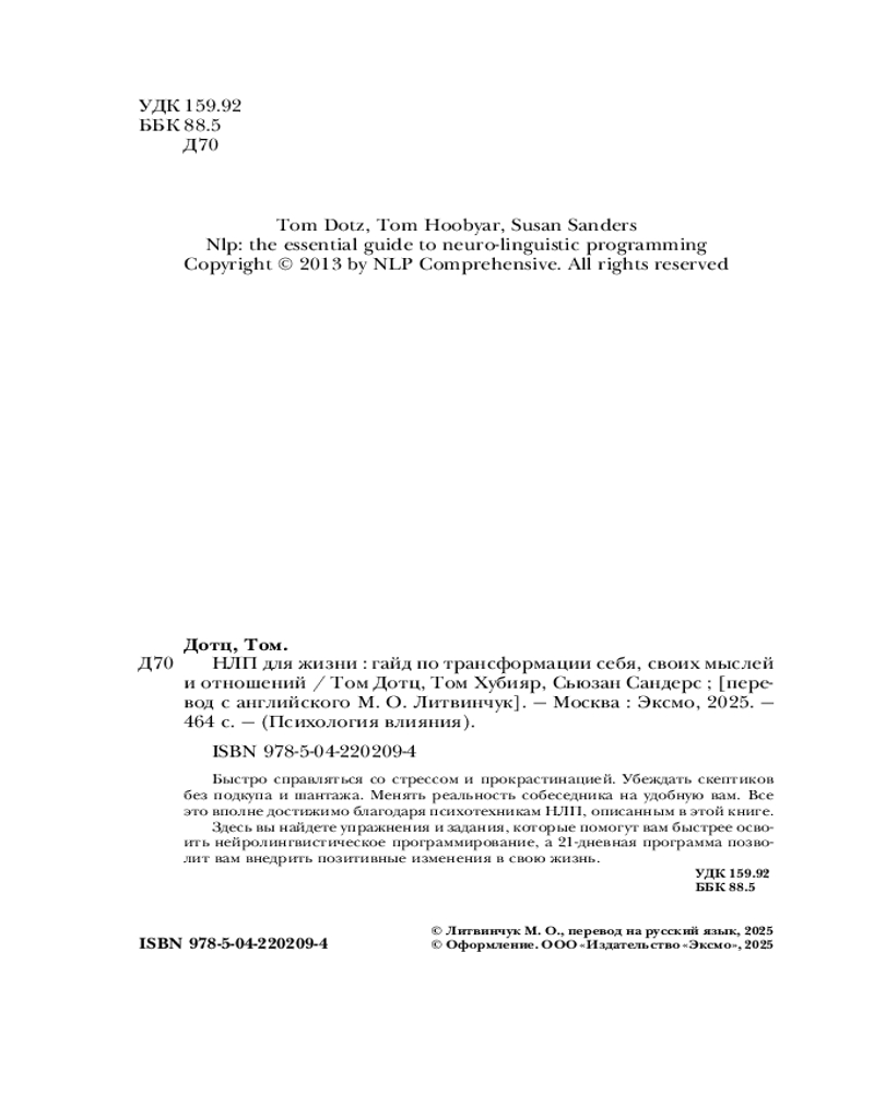 НЛП для жизни. Гайд по трансформации себя, своих мыслей и отношенийТом Дотц, Том Хубияр, Сьюзан Сандерс -20% +139