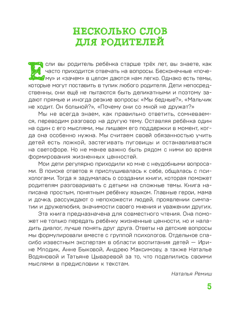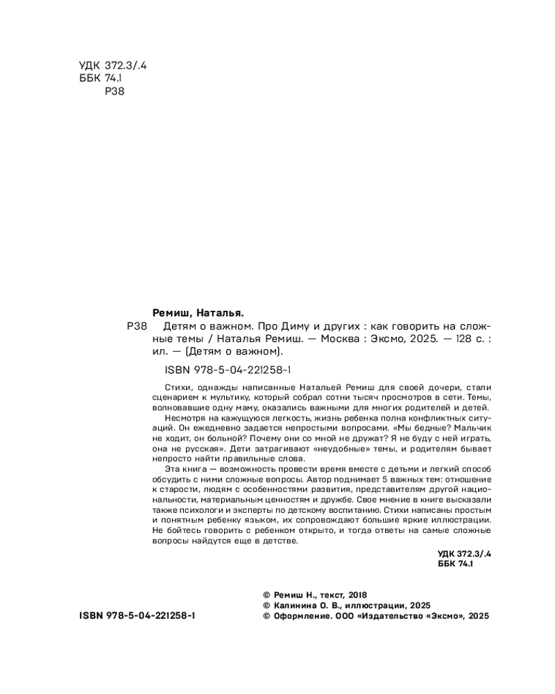 💳 Оплатить за товар можно при получении 🇰🇿 Есть бесплатная доставка по Казахстану от 1 дня 🎁 Копите бонусы с каждой покупки Серия: Детям о важном Стихи, однажды написанные Натальей Ремиш для своей дочери, стали сценарием к мультику, который собрал сотни миллионов просмотров в Сети. Темы, волновавшие одну маму, оказались важными для многих родителей и детей. Несмотря на кажущуюся легкость, жизнь ребенка полна конфликтных ситуаций. Он ежедневно задается непростыми вопросами. «Мы бедные? Мальчик не ходит, он больной? Почему они со мной не дружат? Я не буду с ней играть, она нерусская». Дети затрагивают «неудобные» темы, и родителям бывает непросто найти правильные слова. |
