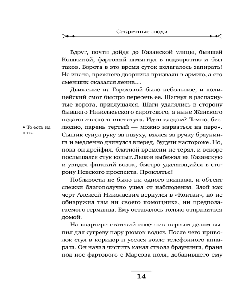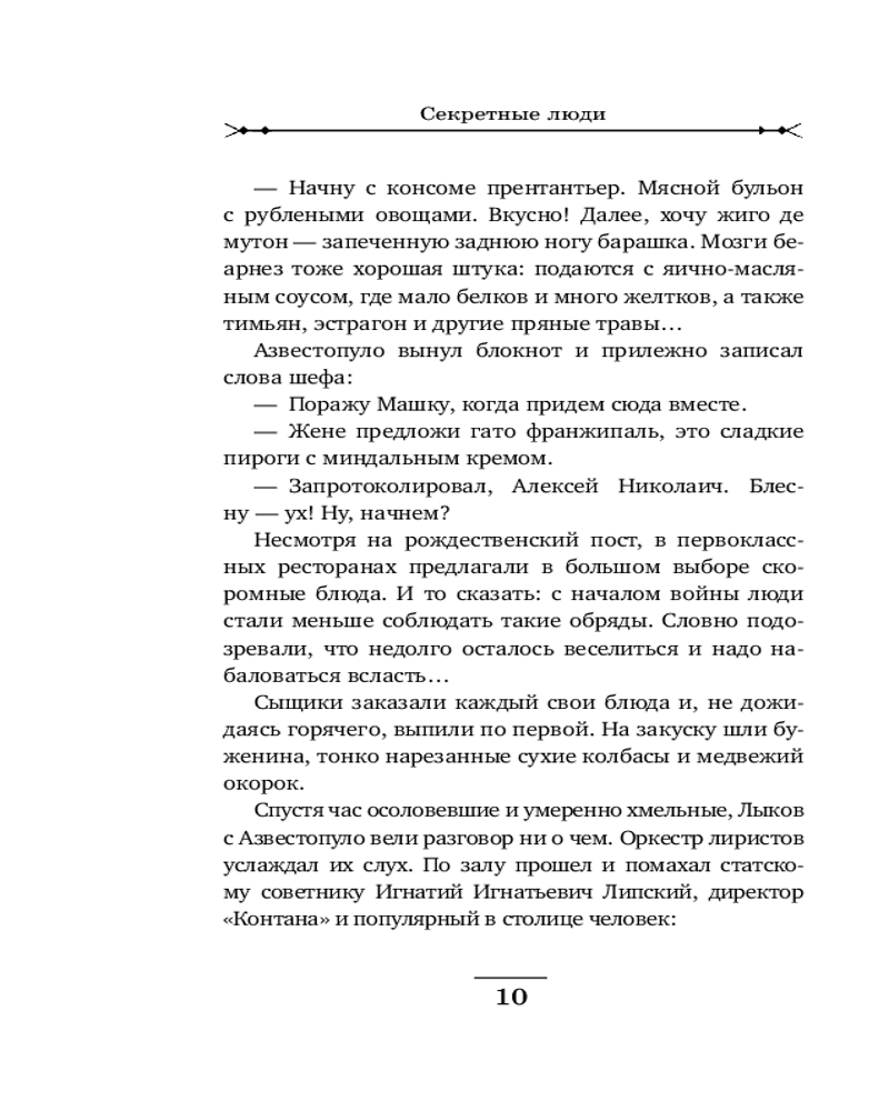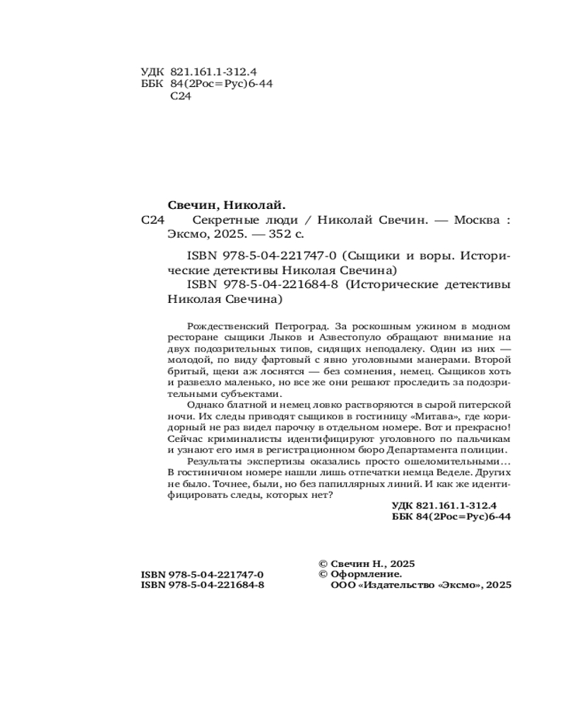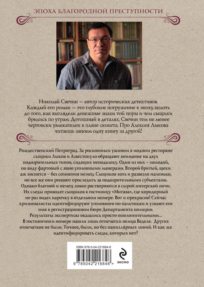 💳 Оплатить за товар можно при получении 🇰🇿 Есть бесплатная доставка по Казахстану 🎁 Копите бонусы с каждой покупки Серия: Исторические детективы Николая Свечина Рождественский Петроград. За роскошным ужином в модном ресторане сыщики Лыков и Азвестопуло обращают внимание на двух подозрительных типов, сидящих неподалеку. Один из них — молодой, по виду фартовый, с явно уголовными манерами. Второй бритый, щеки аж лоснятся — без сомнения немец. Сыщиков хоть и развезло маленько, но всё же они решают проследить за подозрительными субъектами. |
