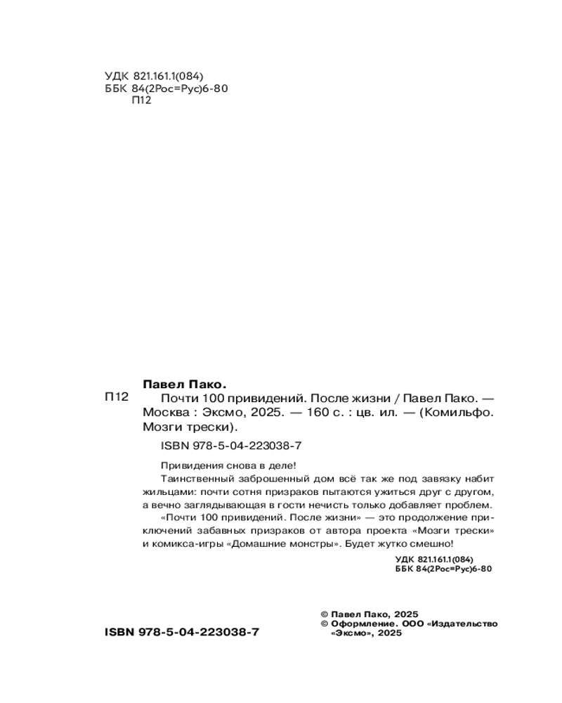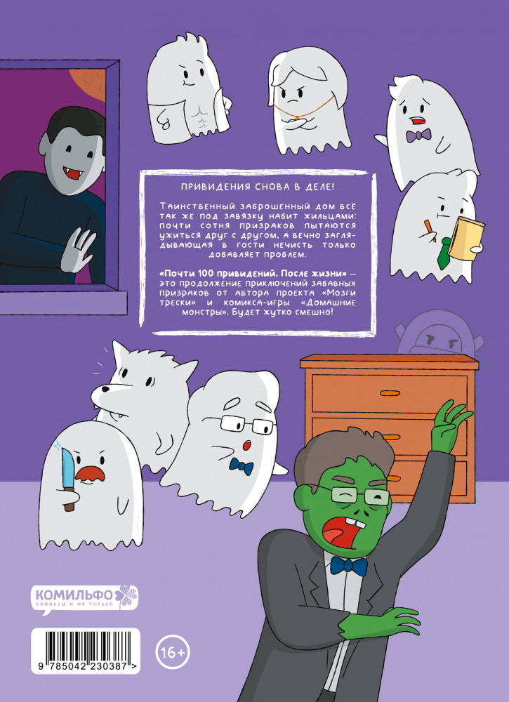 💳 Оплатить за товар можно при получении 🇰🇿 Есть бесплатная доставка по Казахстану от 1 дня 🎁 Копите бонусы с каждой покупки Серия: Мозги трески Привидения снова в деле! Таинственный заброшенный дом всё так же под завязку набит жильцами: почти сотня призраков пытаются ужиться друг с другом, а вечно заглядывающая в гости нечисть только добавляет проблем. «Почти 100 привидений. После жизни» — это продолжение приключений забавных призраков от Павла Пако, автора проекта «Мозги трески» и комикса-игры «Домашние монстры». Будет жутко смешно! |