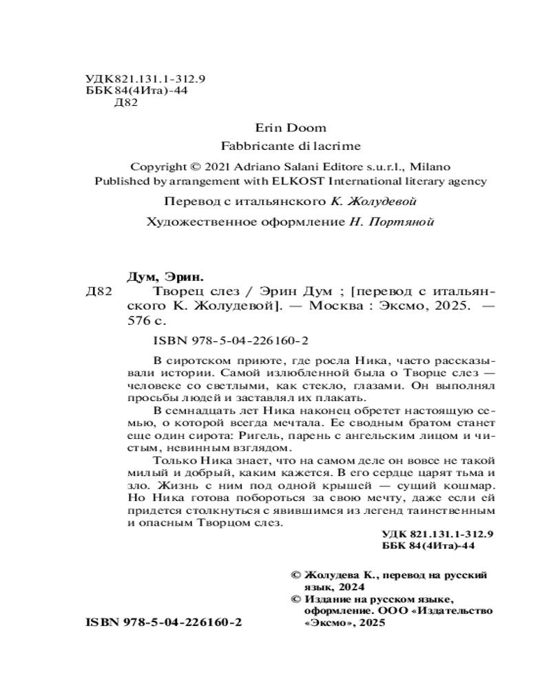 💳 Оплатить за товар можно при получении 🇰🇿 Есть бесплатная доставка по Казахстану от 1 дня 🎁 Копите бонусы с каждой покупки Серия: Магистраль. Творец слез В сиротском приюте, где росла Ника, часто рассказывали истории. Самой излюбленной была о Творце слез, человеке со светлыми, как стекло, глазами. Он выполнял просьбы людей и заставлял их плакать. В семнадцать лет Ника наконец обретет настоящую семью, о которой всегда мечтала. Ее сводным братом станет еще один сирота: Ригель, парень с ангельским лицом и чистым невинным взглядом. Только Ника знает, что на самом деле он вовсе не такой милый и добрый, каким кажется. В его сердце царят тьма и зло. Жизнь с ним под одной крышей — сущий кошмар. Но Ника готова побороться за свою мечту, даже если ей придется столкнуться с явившимся из легенд таинственным и опасным Творцом слез. |