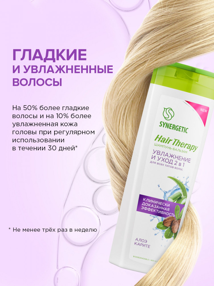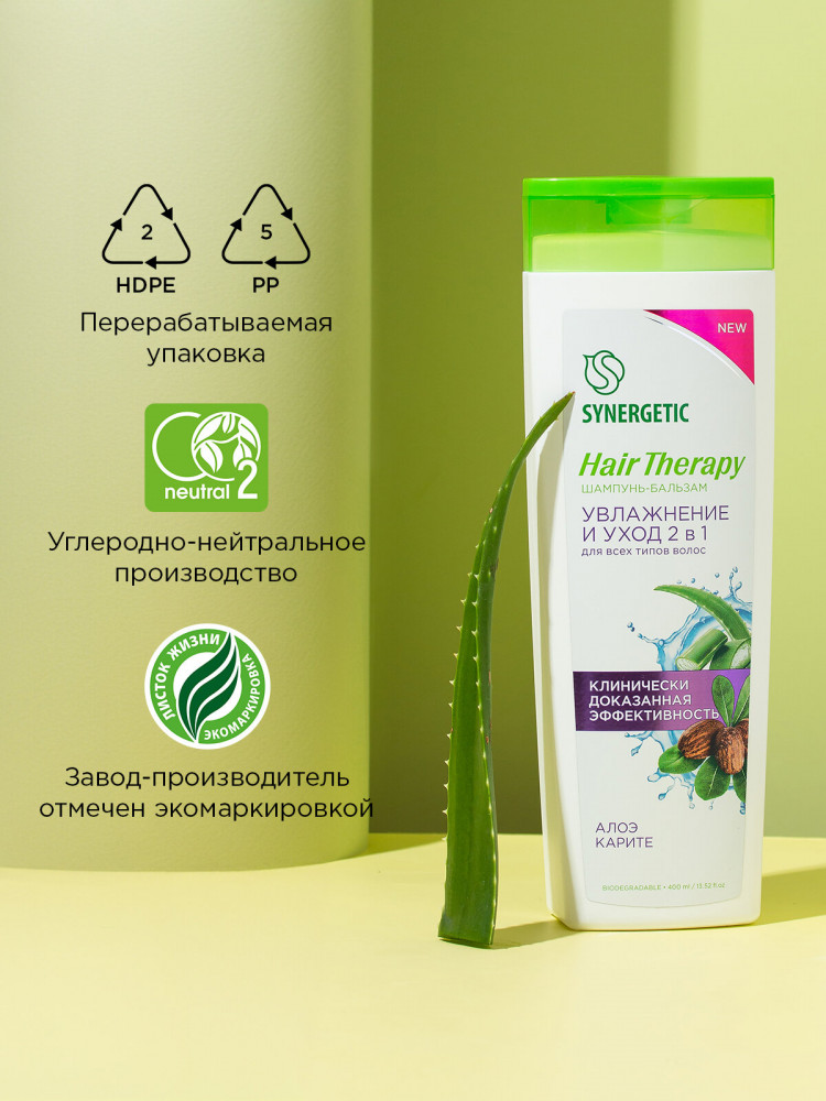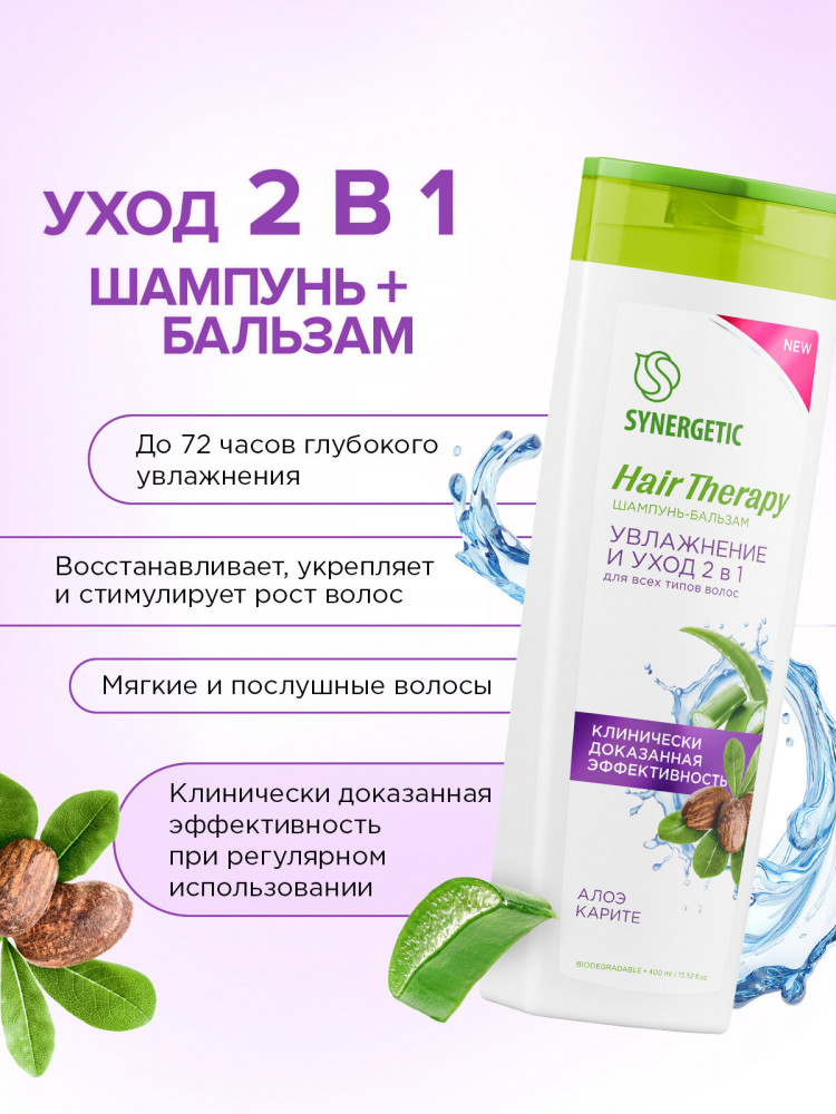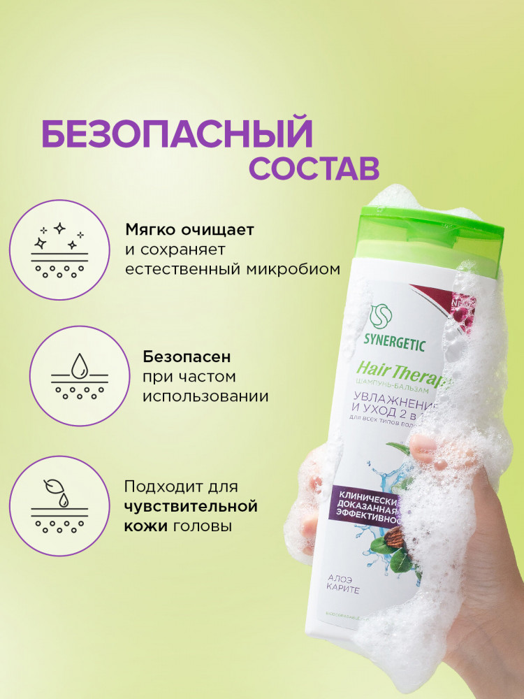 Synergetic Шампунь-бальзам для всех типов волос «Увлажнение и уход 2 в 1. Алоэ и карите»