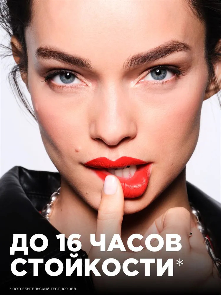 на губах становится матовой через некоторое время, как только подсыхает. слишком жидкая при нанесении, легко течет за контур