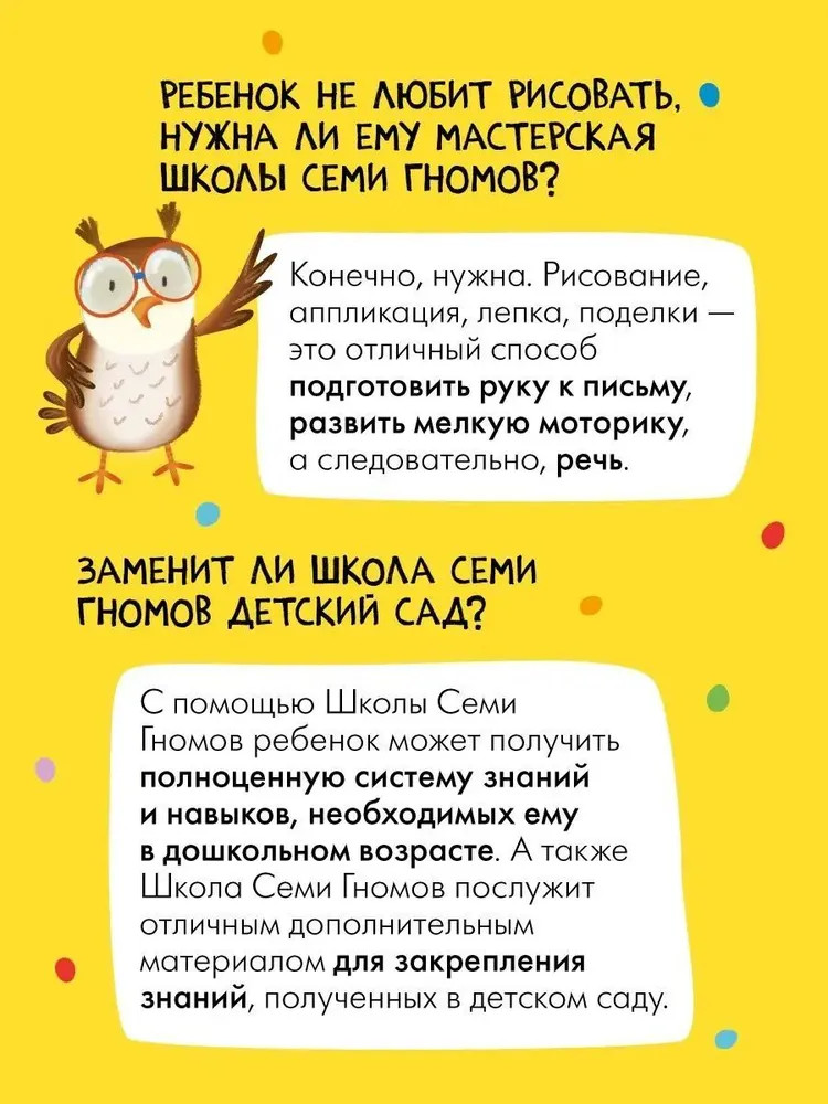 💳 Оплатить за товар можно при получении 🇰🇿 Есть бесплатная доставка по Казахстану от 1 дня 🎁 Копите бонусы с каждой покупки Серия: Школа Семи Гномов. Мастерская «Школа Семи Гномов. Мастерская 4+» представляет собой увлекательный набор альбомов с занятиями для детей от 4 до 5 лет. С этим подарочным комплектом ваш ребенок откроет мир развивающих занятий и творчества. Пошагово, с увеличением сложности заданий, малыш погрузится в мир творчества, создавая уникальные поделки. Всего в программу комплекта входит 5 развивающих альбомов, по которым ребенок изучит разные виды творчества: аппликация, декоративное творчество, лепка, рисование карандашами и красками. Этот сборник — не просто рисовашки, это целая система обучения, соответствующая ФГОС и другим современным стандартам развития детей в возрасте от четырех до пяти лет. Это не только развивающие занятия, это еще и занимательное путешествие по миру искусства для детей дошкольного возраста. Каждая книга помогает развивать мелкую моторику, внимание, а также способствует эмоциональному и творческому развитию дошколят. Данный набор развивашек – отличный выбор для подарка ребенку, будь то день рождения или любой другой детский праздник. Помимо прочего, комплект не только развивает творческие способности, но также он станет отличным инструментом для воспитания ребенка в четыре года. Обучающие занятия, предложенные в книжках, помогут воспитателям и родителям в достижении таких ключевых задач, как формирование у дошкольников интереса к окружающему миру и стимуляция раннего развития. Каждое занятие — это не только игра, но и обучение, способствующее системному формированию навыков рисования, лепки и других видов творчества. |