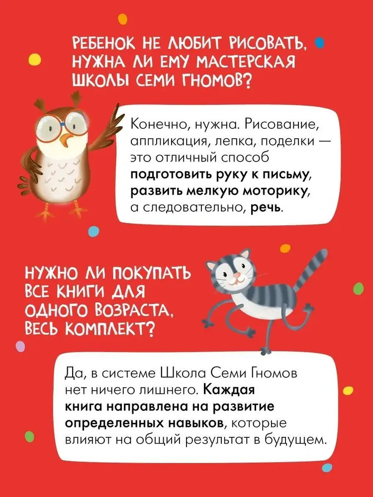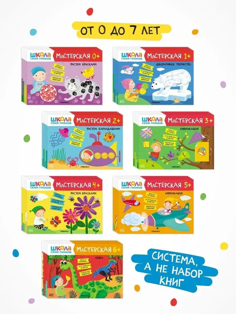 💳 Оплатить за товар можно при получении 🇰🇿 Есть бесплатная доставка по Казахстану от 1 дня 🎁 Копите бонусы с каждой покупки Серия: Школа Семи Гномов. Мастерская «Школа Семи Гномов. Мастерская 6+» представляет собой увлекательный набор альбомов с занятиями для детей от 6 до 7 лет. С этим подарочным комплектом ваш ребенок откроет мир развивающих занятий и творчества. Пошагово, с увеличением сложности заданий, малыш погрузится в мир творчества, создавая уникальные поделки. Всего в программу комплекта входит 5 развивающих альбомов, по которым ребенок изучит разные виды творчества: аппликация, декоративное творчество, лепка, рисование карандашами и красками. Этот сборник — не просто рисовашки, это целая система обучения, соответствующая ФГОС и другим современным стандартам развития детей в возрасте от шести до семи лет. Это не только развивающие занятия, это еще и занимательное путешествие по миру искусства для детей дошкольного возраста. Каждая книга помогает развивать мелкую моторику, внимание, а также способствует эмоциональному и творческому развитию дошколят. Данный набор развивашек – отличный выбор для подарка ребенку, будь то день рождения или любой другой детский праздник. Помимо прочего, комплект не только развивает творческие способности, но также он станет отличным инструментом для воспитания ребенка в шесть лет. Обучающие занятия, предложенные в книжках, помогут воспитателям и родителям в достижении таких ключевых задач, как формирование у дошкольников интереса к окружающему миру и стимуляция раннего развития. Каждое занятие — это не только игра, но и обучение, способствующее системному формированию навыков рисования, лепки и других видов творчества. |