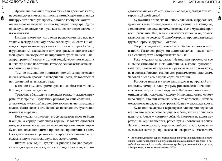 Искусство может убить, извратить и забрать твою душу. Женя Кац знает об этом не понаслышке. Она приезжает в Санкт-Петербург ради мечты — поступить в Академию художеств, а также чтобы помириться со старшей сестрой Кирой. Только вот та сильно изменилась: стала апатичной, злой, зато в ней проснулся художественный талант. Женя пока не знает, что произошло с сестрой. Но в доме Киры ей постоянно снятся кошмары про человека в черном с раздвоенными зрачками. Именно он изображен на картине «Дьявольские глаза», купленной старшей сестрой на рынке. Ходят слухи, что это полотно проклято и подчиняет себе волю человека. Так ли это на самом деле? Кем был его создатель? И что более ценно: спокойная жизнь или талант? |
