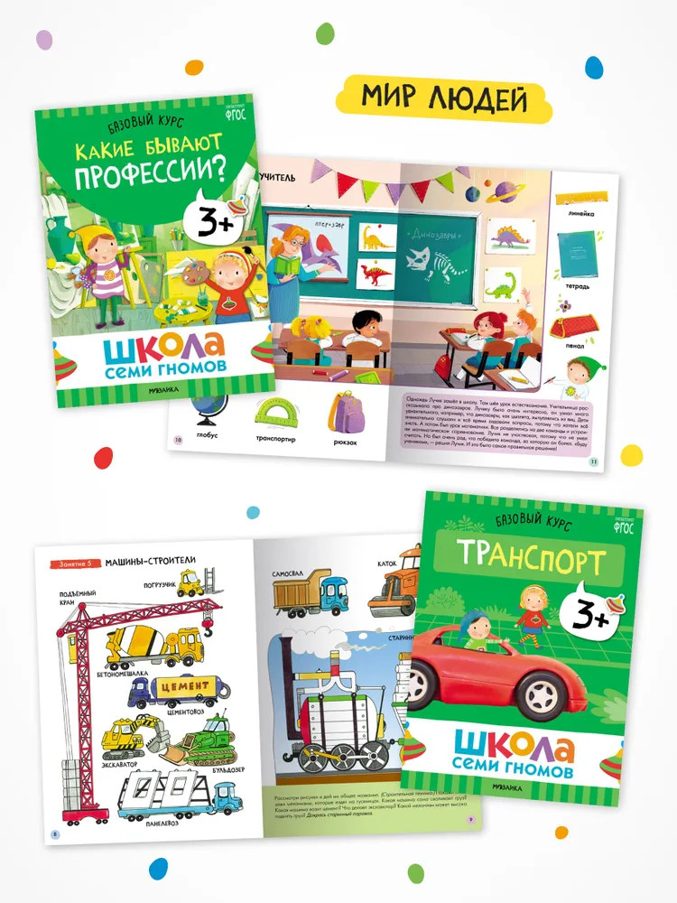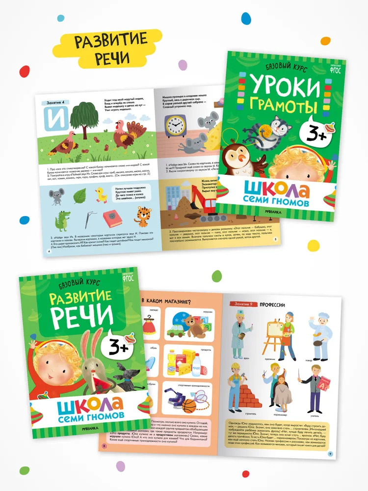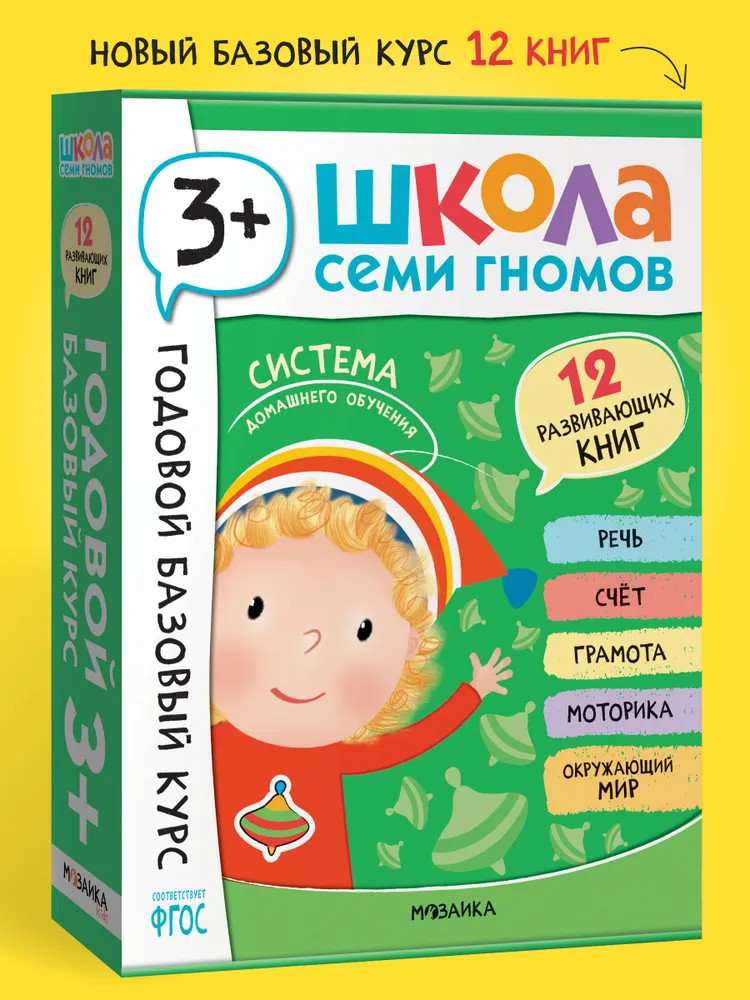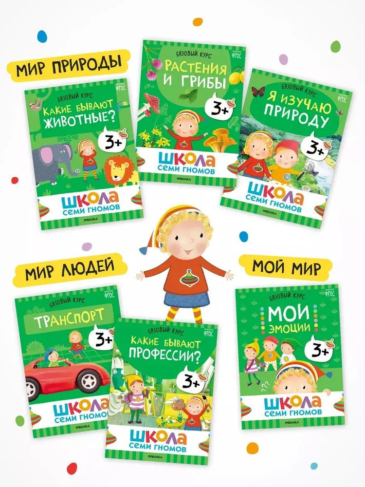 Серия: Школа Семи Гномов. Годовой базовый курс Набор «Школа Семи Гномов. Базовый курс 3+», 12 книжек + плакат, игра и диплом. Комплект включает в себя книги «Время, пространство», «Уроки грамоты», «Счет, форма, величина», «Развитие речи», «Прописи для малышей», «Логика, мышление», «Какие бывают животные?», «Растения и грибы», «Я изучаю природу», «Транспорт», «Какие бывают профессии» и «Мои эмоции». Часть этих книжек направлена на развитие когнитивных способностей ребенка: познавательный интерес, умение думать, анализировать и делать выводы. Другая часть книжек посвящена окружающему миру и знакомит ребенка с природой и миром людей.
