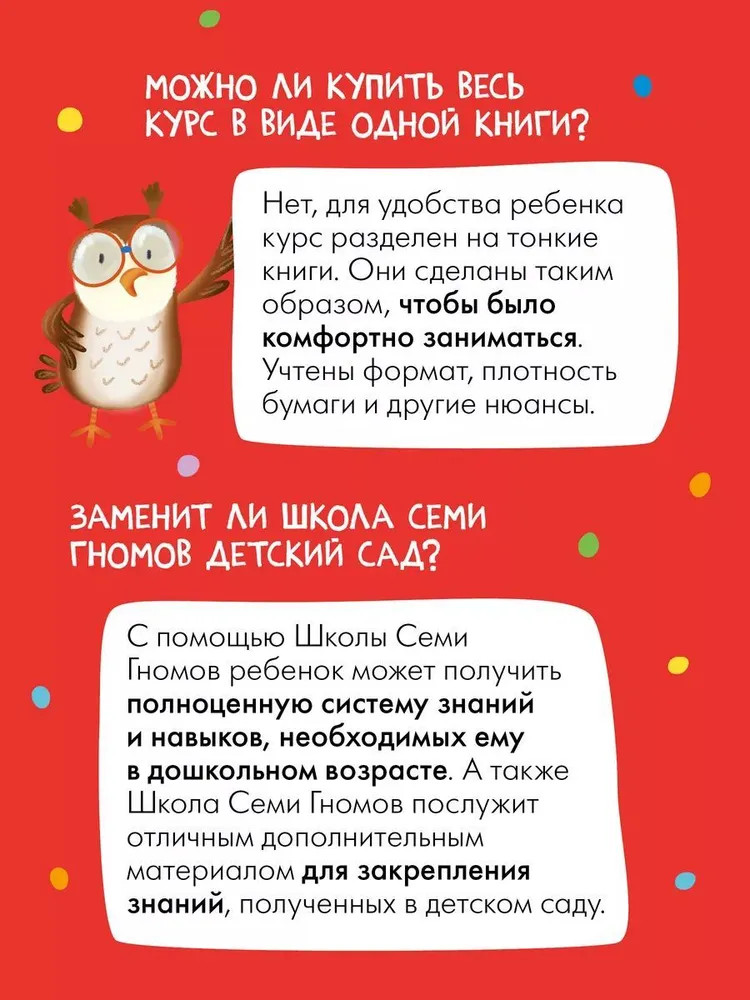 Школа Семи Гномов — это система, а не набор книг. Она выстроена таким образом, чтобы ребёнок получил необходимые знания в правильный момент. Поэтому все книги в Школе Семи Гномов имеют четкую возрастную адресацию и разработаны строго с учетом возрастных возможностей ребенка. Но самое важное, чтобы занятия с ребенком давали результат и приносили радость. Поэтому все задания выстроены от простого к сложному и следуют принципу «развитие через игру».