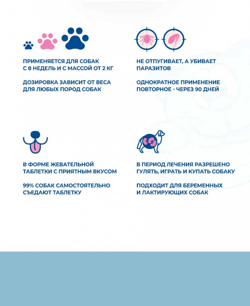 Средство от блох и клещей в форме таблетки подходит для всех собак, включая мелкие и крупные породы. Дозировка зависит от веса собаки.