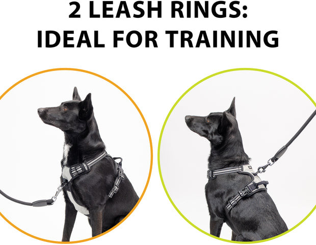 Одним из ключевых преимуществ шлейки Vigor является наличие двух колец для крепления поводка: одно расположено на груди, другое — сверху. Эта двойная конфигурация позволяет адаптировать контроль над собакой в зависимости от конкретных потребностей дрессировки, обеспечивая стабильность и безопасность в любой ситуации.