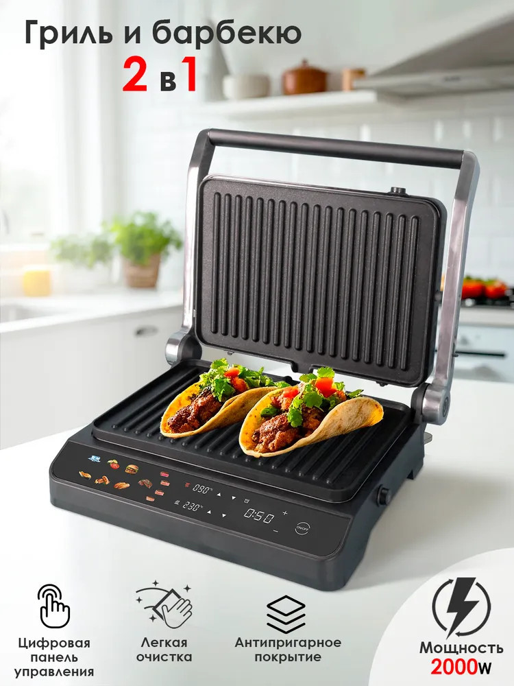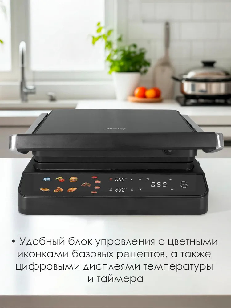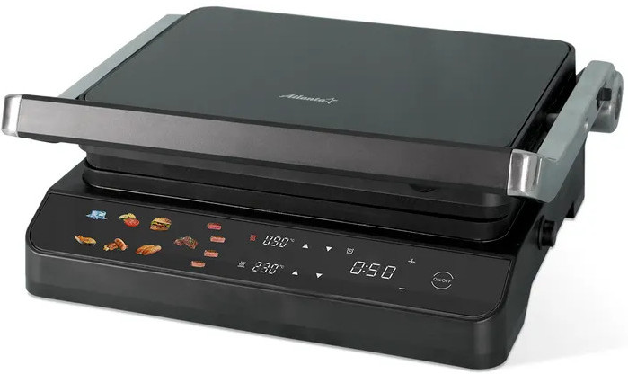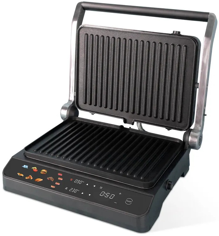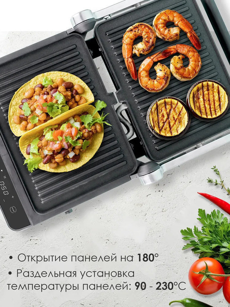 Прибор оснащен цифровым блоком контроля температуры, который позволяет регулировать температуру отдельно для каждой панели от 90 до 230°С, благодаря чему вы сможете приготовить самые разнообразные блюда на гриле: мясо, рыбу, морепродукты, овощи.
