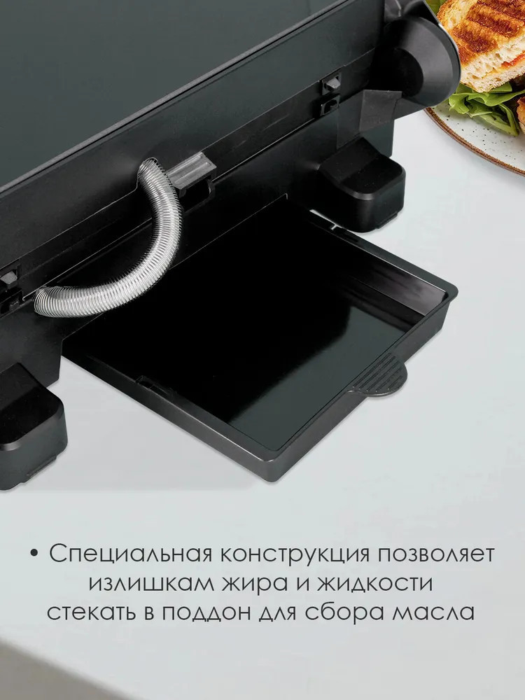 Специальная конструкция позволяет излишкам жира и жидкости стекать в поддон для сбора масла в задней части гриля. Съёмные пластины гриля с антипригарным покрытием и съемный поддон для сбора масла обеспечивают легкую очистку. Все, что вам нужно, это просто протереть его влажной тканью.