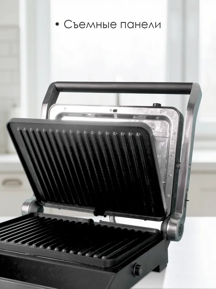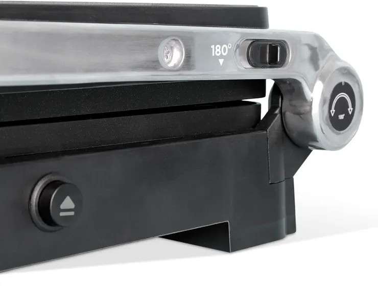 Гриль раскрывается на 180°, что позволяет готовить в режиме барбекю: на двух панелях одновременно.