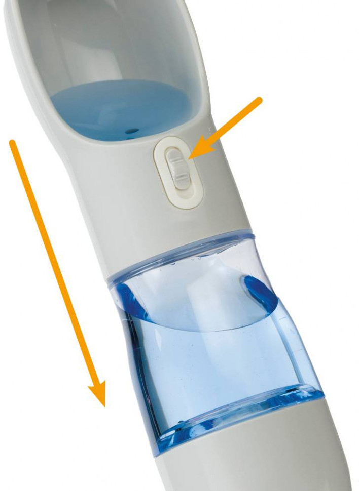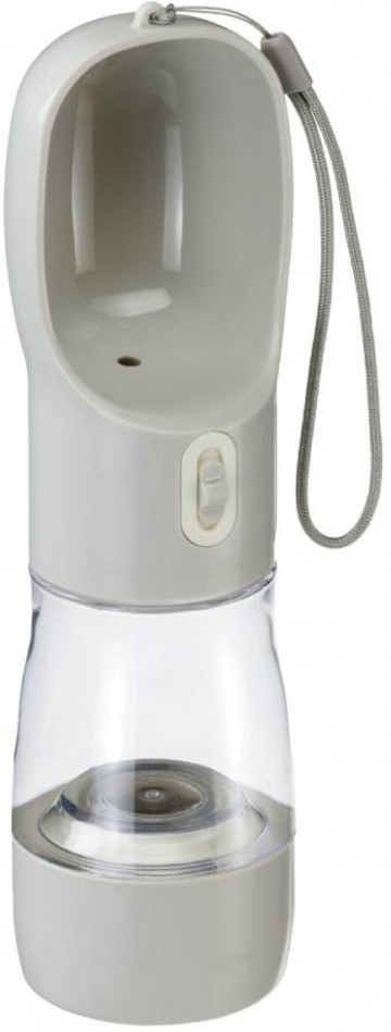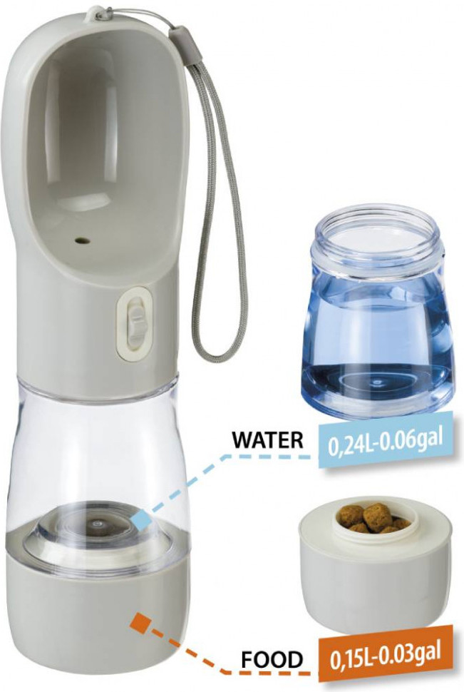 Дорожная поилка для собак. Не проливается. Вода подается нажатием кнопки. В нижней части есть небольшая емкость для корма или лакомства объемом 150 мл. Объем воды: 240 мл. Материал: прочный пластик. Прозрачная колба для визуального контроля объема воды. Легко моется