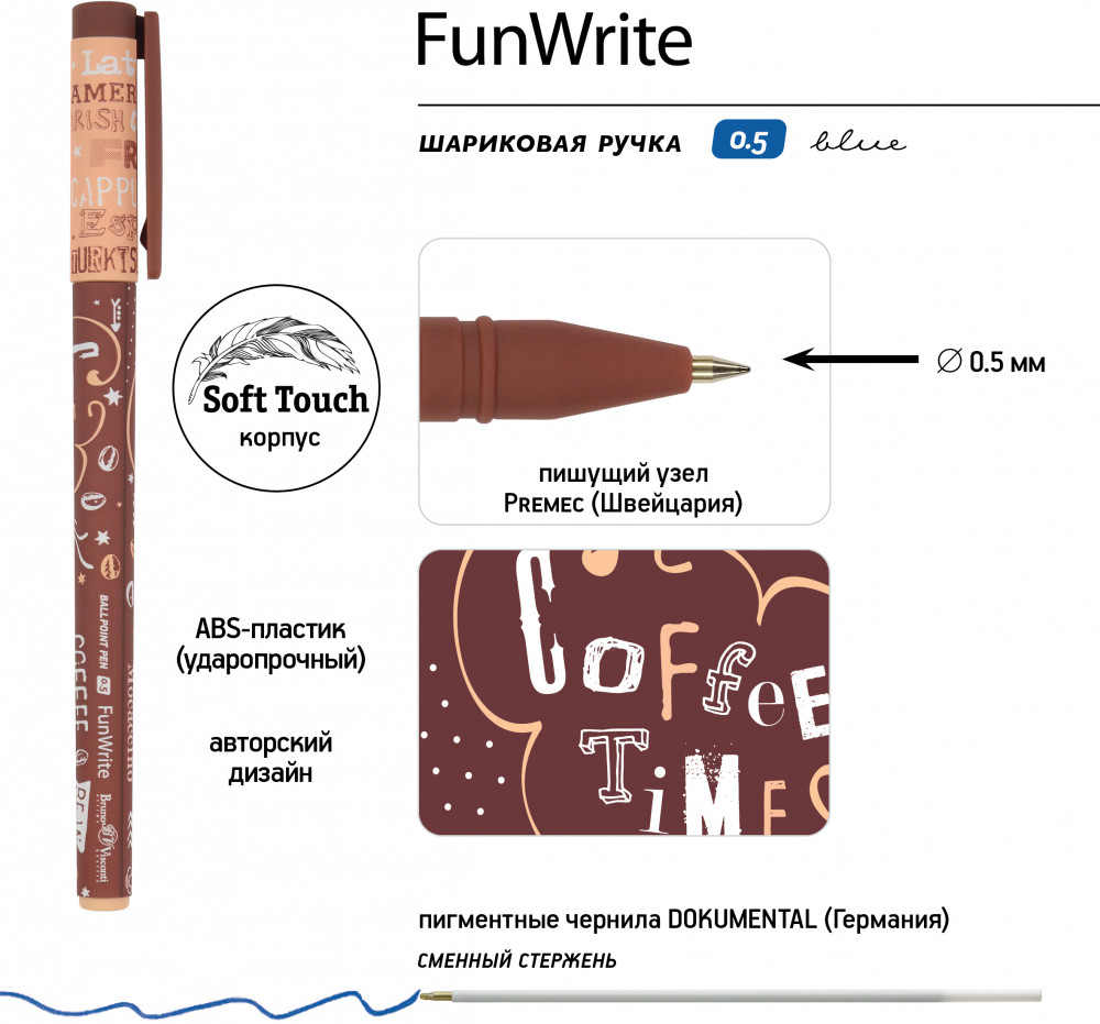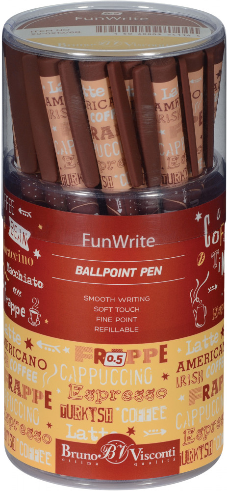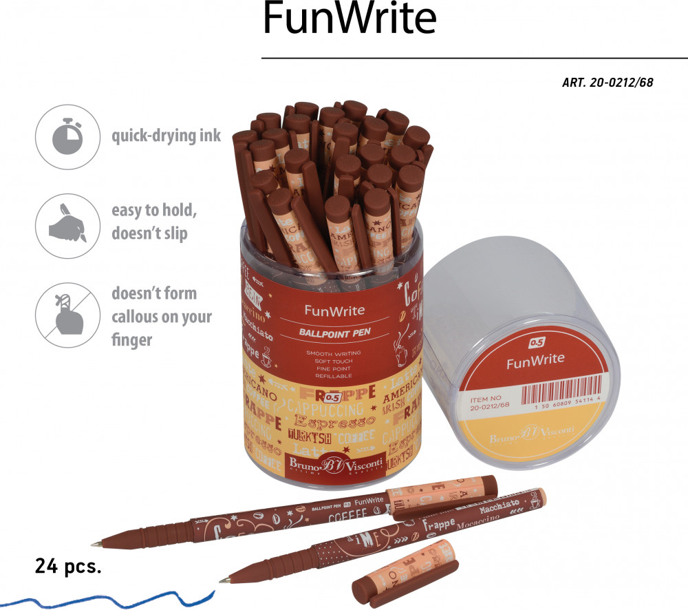 Bruno Visconti Ручка шариковая «Латте»В данный момент этот товар отсутствует в продаже. Возможно, у нас найдется аналогичный или похожий товар здесь. Серия: FunWrite При больших объемах письменных работ необходимо максимально снизить нагрузку на руку и обеспечить легкое письмо. Поэтому оптимальна на такие случаи ручка с прорезиненным грипом, антискользящим покрытием корпуса, надежным пишущим узлом и чернилами, обеспечивающими мягкое скольжение. Шариковая ручка «FunWrite» от Bruno Visconti — обладательница таких характеристик: бархатистое покрытие Soft Touch, немецкое качество синих чернил DOKUMENTAL и пишущий узел Premec (Швейцария). Корпус изготовлен из ABS-пластика, который гнется при ударе или сильном нажиме, но не ломается. Оригинальный дизайн ручки как «вишенка на торте» — дополнительная характеристика, не позволяющая отказаться от ее обладания. Ручка «FunWrite» — идеальна для школы, выполнения рабочих задач в офисе, дома. |