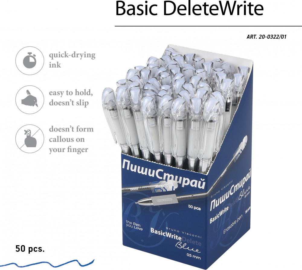 💳 Оплатить за товар можно при получении 🇰🇿 Есть бесплатная доставка по Казахстану от 1 дня 🎁 Копите бонусы с каждой покупки Легкая, прозрачная ручка Basic DeleteWrite c термочувствительными гелевыми стираемыми чернилами безусловно понравится всем поклонникам ручки «Пиши-стирай». Basic DeleteWrite — абсолютно новая концепция в широкой линейке ручек Bruno Visconti. |