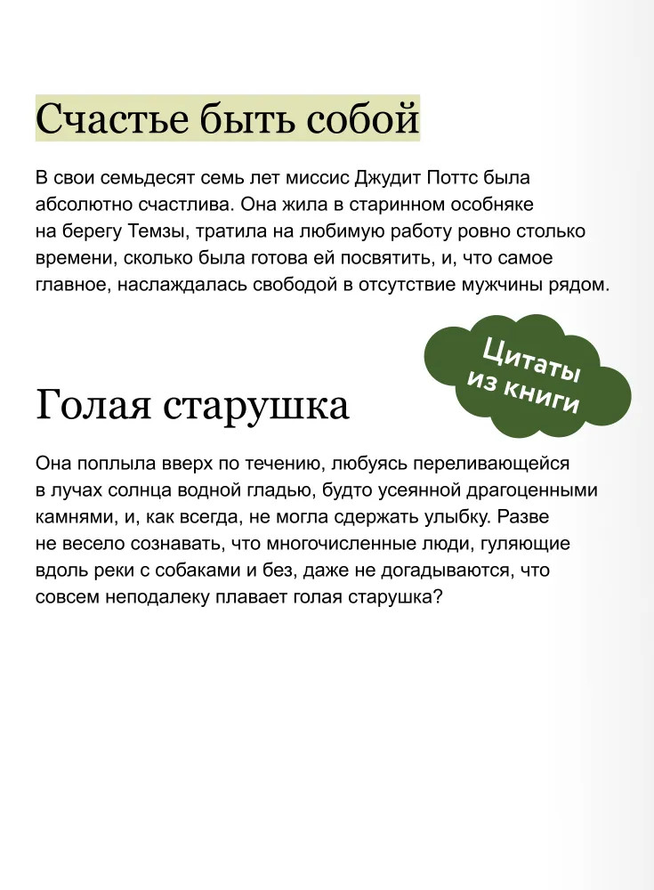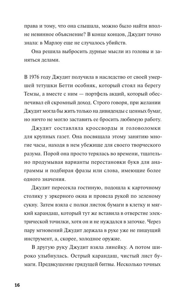 💳 Оплатить за товар можно при получении 🇰🇿 Есть бесплатная доставка по Казахстану от 1 дня 🎁 Копите бонусы с каждой покупки Серия: Клуб убийств Джудит Поттс 77 лет, она составляет кроссворды, купается голой в Темзе и наслаждается свободой и одиночеством. Но она определенно не из тех, кто держится подальше от чужих дел. Когда ее сосед загадочным образом пропадает, а полиция не принимает происшествие всерьез, миссис Поттс решает разобраться в этой истории. К Джудит присоединяются местная собачница Сьюзи и жена священника Бекс. |