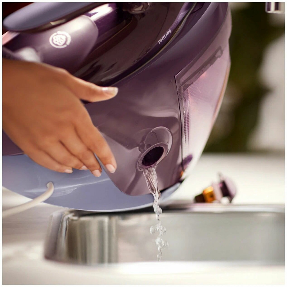 Регулярная очистка от накипи защищает утюг, продлевает срок его службы и обеспечивает эффективную подачу пара. Уникальная система Easy De-Calc постоянно собирает накипь, а световой индикатор сообщает, когда необходимо опустошить контейнер. Просто снимите клапан и вылейте грязную воду с частицами известкового налета.