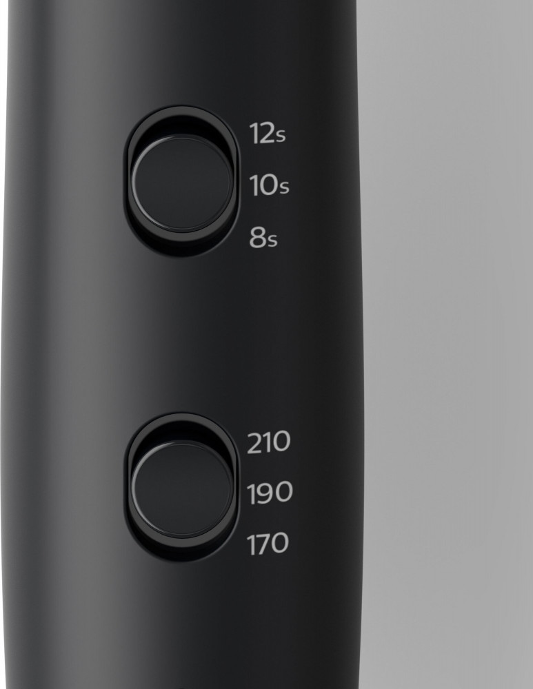 3 настройки температуры (170 °C/190 °C/210 °C) и 3 настройки времени (12 сек./10 сек./8 сек.) позволяют создавать великолепные свободные или упругие локоны на разных типах волос. Например, при высокой температуре и длительной завивке получатся более тугие локоны — идеально для густых волос. Низкая температура в сочетании с небольшой длительностью завивки позволит создать превосходную укладку на волосах, которым требуется особенно бережный уход.