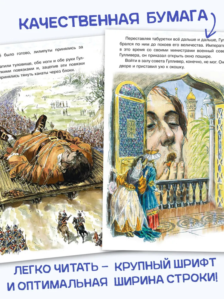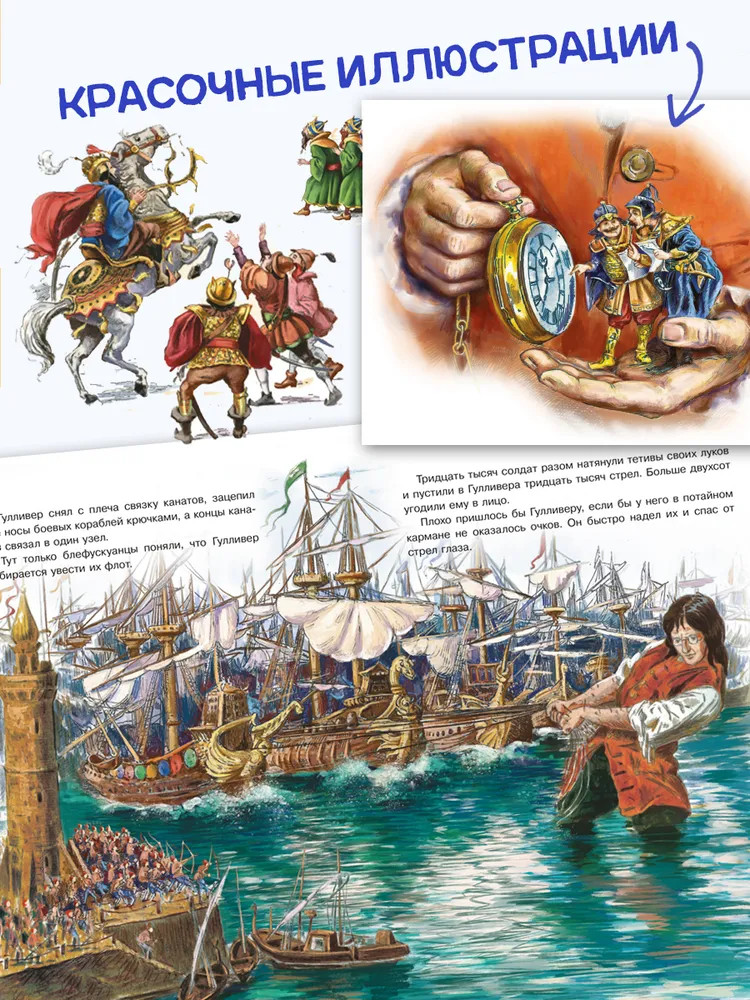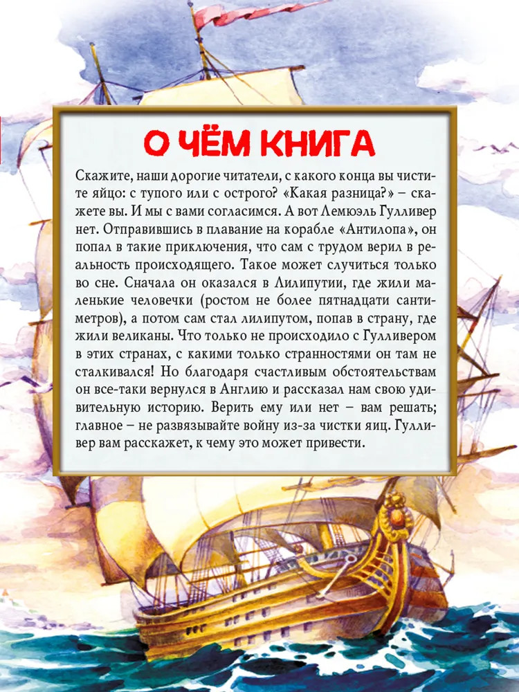 Скажите, наши дорогие читатели, с какого конца вы чистите яйцо: с тупого или острого? «Какая разница?» — скажите вы. И мы с вами согласимся. А вот Лемюэль Гулливер нет. Отправившись в плавание на корабле «Антилопа», он попал в такие приключения, что сам с трудом верил в реальность происходящего. Такое может случиться только во сне. Сначала он оказался в Лилипутии, где жили маленькие человечки ( ростом не более пятнадцати сантиметров), а потом сам стал лилипутом, попав в страну, где жили великаны. Что только не происходило с Гулливером в этих странах, с какими только странностями он там не сталкивался! Но благодаря счастливым обстоятельствам он все-таки вернулся в Англию и рассказал нам свою удивительную историю. Верить ему или нет — вам решать; главное — не развязывайте войну из-за чистки яиц. Гулливер вам расскажет, к чему это может привести. |