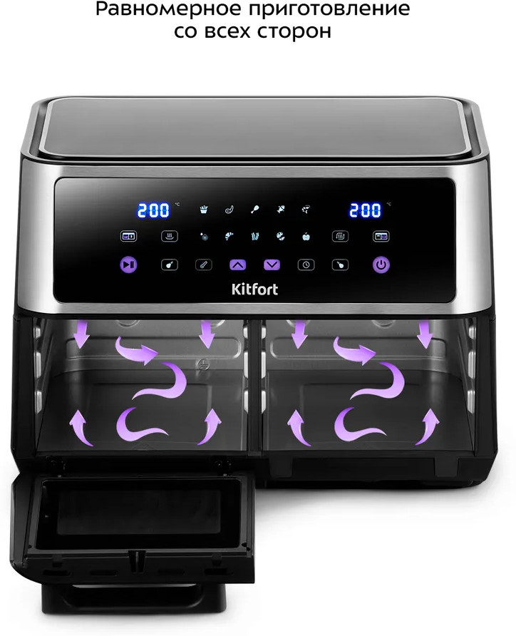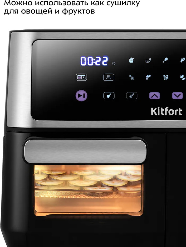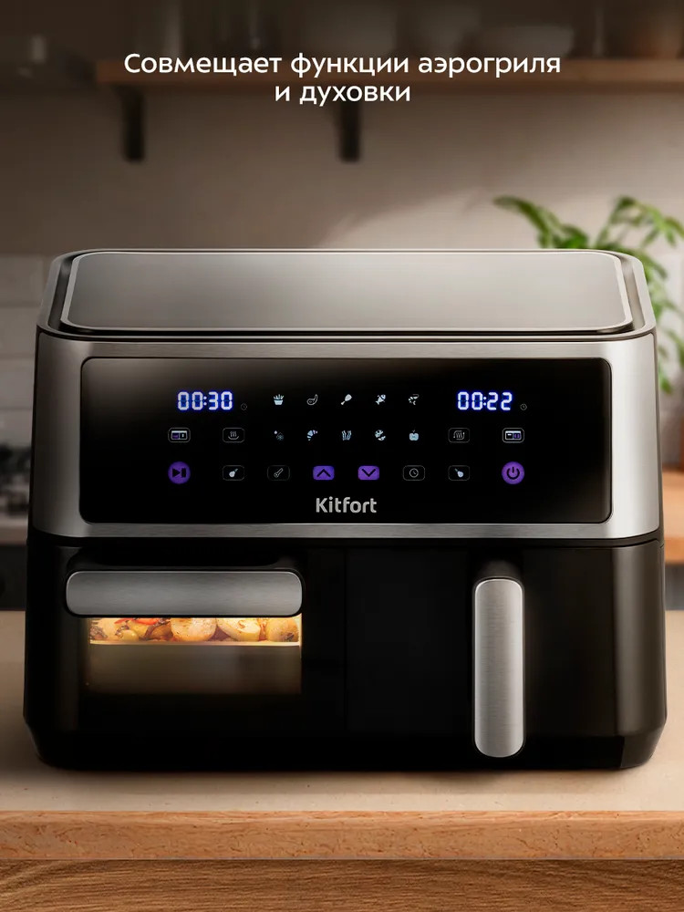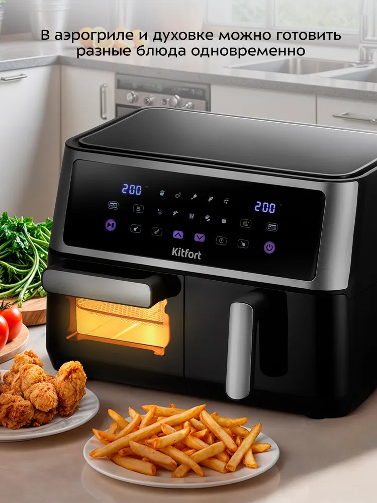 Современный аэрогриль «2 в 1» Kitfort КТ-2256 является универсальным устройством для приготовления пищи, совмещает в себе функции аэрогриля и духовки, а также позволяет готовить большинство продуктов без добавления масла.