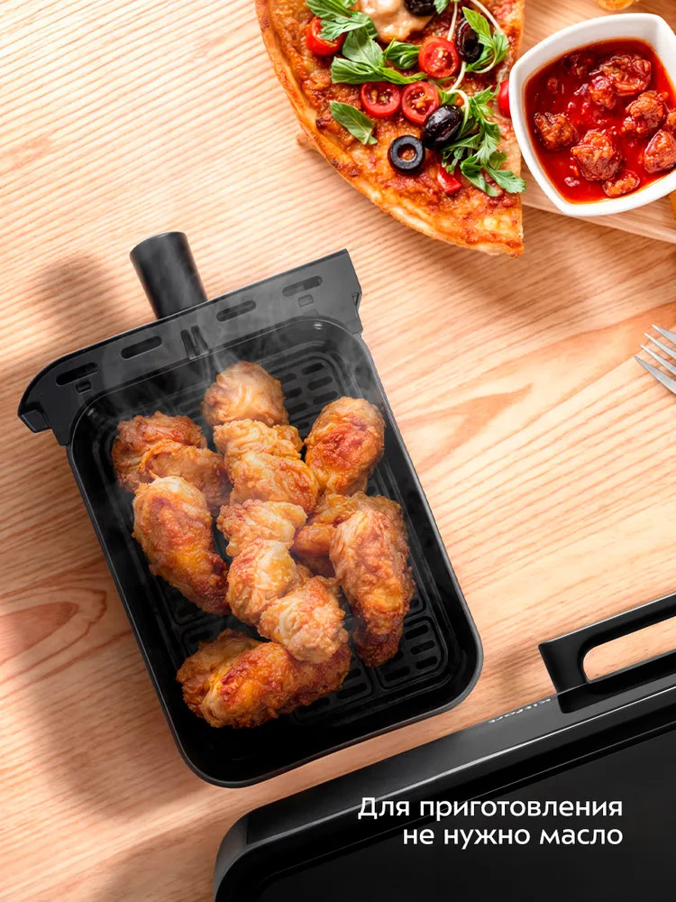 При помощи системы циркуляции горячего воздуха продукты равномерно обжариваются со всех сторон и получаются нежными внутри и с хрустящей корочкой снаружи. В аэрогриле продукты не пригорают, а процесс готовки не требует постоянного присутствия на кухне.