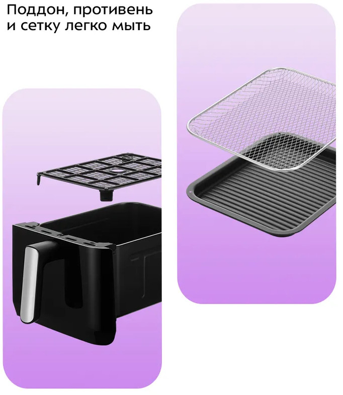 Главное преимущество данного аэрогриля заключается в том, что у него имеется две независимых части с отдельными нагревателями. Вы можете готовить 2 разных блюда одновременно, установив при этом для каждого свои настройки температуры и таймера.