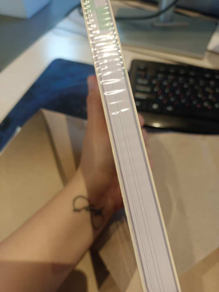 хорошая упаковка в пленку(помимо бумаги). Толстая обложка, объемный блокнот, гладкие и белоснежные листы.