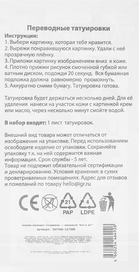 💳 Оплатить за товар можно при получении 🇰🇿 Есть бесплатная доставка по Казахстану от 1 дня 🎁 Копите бонусы с каждой покупки Переводные татуировки «До нашей эры» ТМ «Мульти Арт» — отличный способ внести в свою внешность что-то новое и оригинальное. При помощи этого набора можно украсить себя стильными картинками, которые легко смываются, безопасны для детей, а главное, их можно менять. Татуировки держатся несколько дней. Для их удаления необходимо нанести на участок кожи с картинкой крем или масло и смыть через несколько минут водой. |