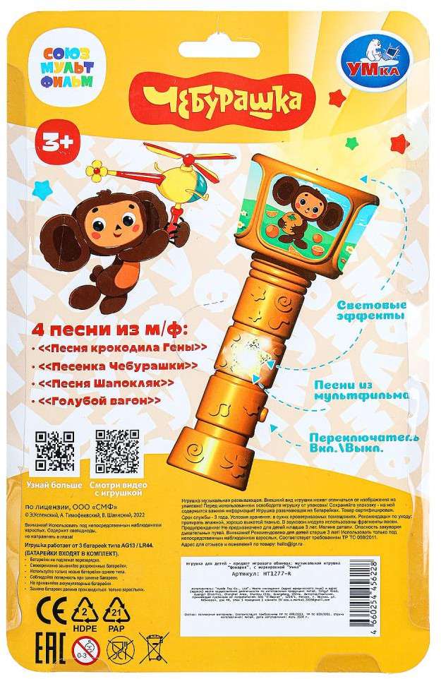 💳 Оплатить за товар можно при получении 🇰🇿 Есть бесплатная доставка по Казахстану от 1 дня 🎁 Копите бонусы с каждой покупки Серия: Чебурашка Музыкальная игрушка «Волшебный фонарик» из серии «Чебурашка» ТМ «УМка» станет прекрасным подарком для маленьких поклонников мультфильма про забавного ушастика. Вашего малыша приведёт в восторг эта игрушка в виде фонарика с изображением любимого мультгероя. Он с удовольствием будет слушать любимые песенки, весёлые фразы и забавные звуки.Музыкальная игрушка ТМ «УМка» способствует развитию: слухового восприятия и музыкального слуха, тактильных навыков, визуального восприятия, логического мышления и мелкой моторики. |