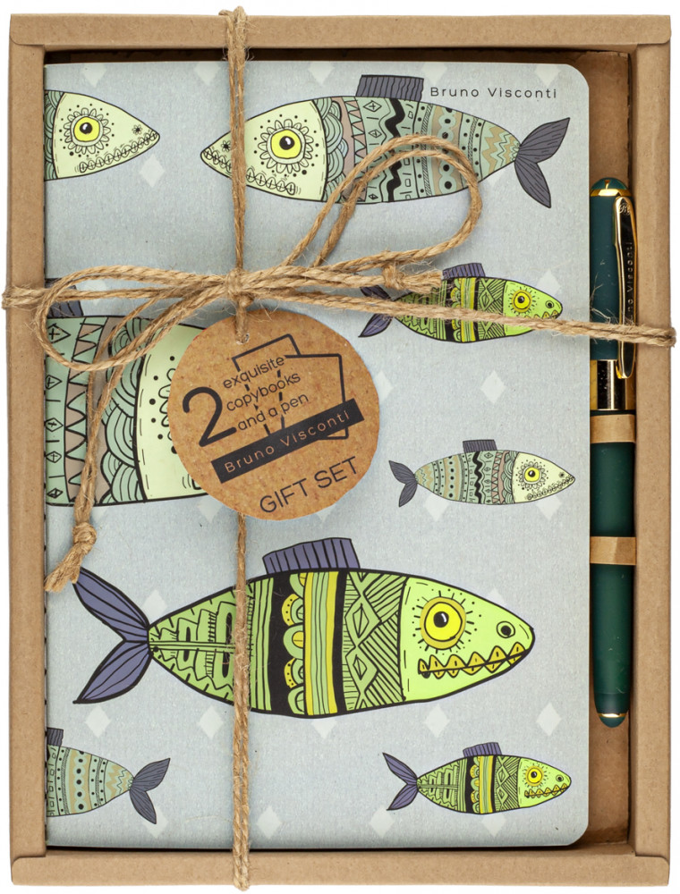 Bruno Visconti Набор подарочный «Рыба моя!»В данный момент этот товар отсутствует в продаже. Возможно, у нас найдется аналогичный или похожий товар здесь. Подарочный набор «Рыба моя» приглянется любителям необычных орнаментов и узоров. Набор состоит из двух тетрадей с обложкой светло-серого цвета, на всей площади которой разместились сверхмодные рыбки, бороздящие просторы дизайнерского океана. Дополняет набор шариковая ручка в зеленом корпусе с фурнитурой золотого цвета. Высококачественные полиграфические материалы позволяют активно использовать тетрадь, сохраняя опрятный внешний вид. Обложка — мелованный картон 190 г/кв.м, блок — бежевая офсетная бумага плотностью 70 г/кв.м. Нестандартная линовка блока в клетку 4.5 мм позволяет вести аккуратные записи и заметки. Шитье тетради декоративной нитью является дополнительным украшением дизайна и прочно скрепляет блок и обложку. |