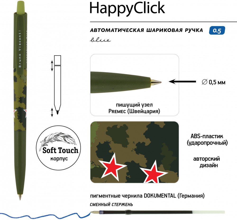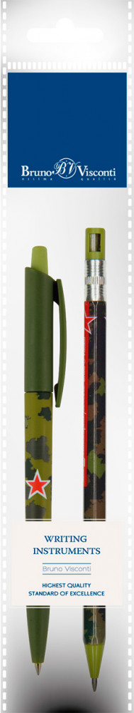 Bruno Visconti Набор «Happyclick. FunGraphix. Милитари»В данный момент этот товар отсутствует в продаже. Возможно, у нас найдется аналогичный или похожий товар здесь. Тактильно приятная, имеющая надежный и простой нажимной механизм с бесперебойной подачей стержня, ручка «HappyClick» от Bruno Visconti станет неизменным помощником в учебе и работе. Комфортный корпус изготовлен из ABS-пластика, что обеспечивает высокую ударопрочность, износостойкость. Бархатное покрытие Soft Touch гарантирует комфортное письмо, рука не устанет при длительном использовании. Удобный пластиковый клип на колпачке позволяет закрепить ручку, например, на ежедневнике, тетради, блокноте. Мягкость, качество письма и тонкость линии 0.38 мм гарантированы производителями пишущего узла — всемирно известной компанией Premec (Швейцария) и чернил — немецким производителем Dokumental. Шестигранный корпус механического карандаша «FunGraphix» изготовлен из ударопрочного пластика и имеет на конце точилку для заточки грифеля. Сам грифель увеличенного диаметра −2 мм, имеет степень жесткости HB. Оптимальный вариант для скетчинга и зарисовок. Но станет отличным помощником в учебе или работе офиса. |