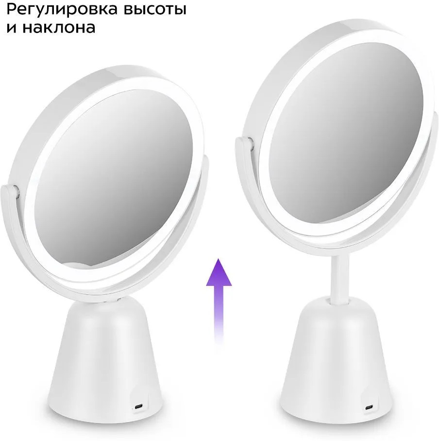 Способ применения: установите зеркало на горизонтальную плоскую поверхность на расстоянии не менее 15 см от края так, чтобы вам было видно свое отражение. Нажмите на кнопку «Вкл/Выкл», чтобы включить подсветку. Подсветка зеркал включится и будет гореть холодным белым светом. Нажмите на кнопку «Вкл/Выкл» один или два раза, чтобы сменить цветовую температуру подсветки на нейтральный или теплый свет соответственно. Чтобы отрегулировать яркость подсветки, нажмите и удерживайте кнопку «Вкл/Выкл» до тех пор, пока яркость подсветки не станет комфортной. Чтобы снова изменить яркость подсветки, отпустите кнопку «Вкл/Выкл» и снова нажмите и удерживайте ее. Отрегулируйте зеркало по высоте. Для этого просто потяните зеркало за корпус вверх или вниз. Поверните зеркальную поверхность с увеличением или без на себя в зависимости от того, каким зеркалом собираетесь пользоваться. Отрегулируйте наклон зеркала, удерживая одной рукой ножку зеркала, а другой наклоняя зеркало за верхнюю часть. По окончании использования отключите подсветку, для этого нажмите на кнопку «Вкл/Выкл» один или несколько раз, пока подсветка не выключится.