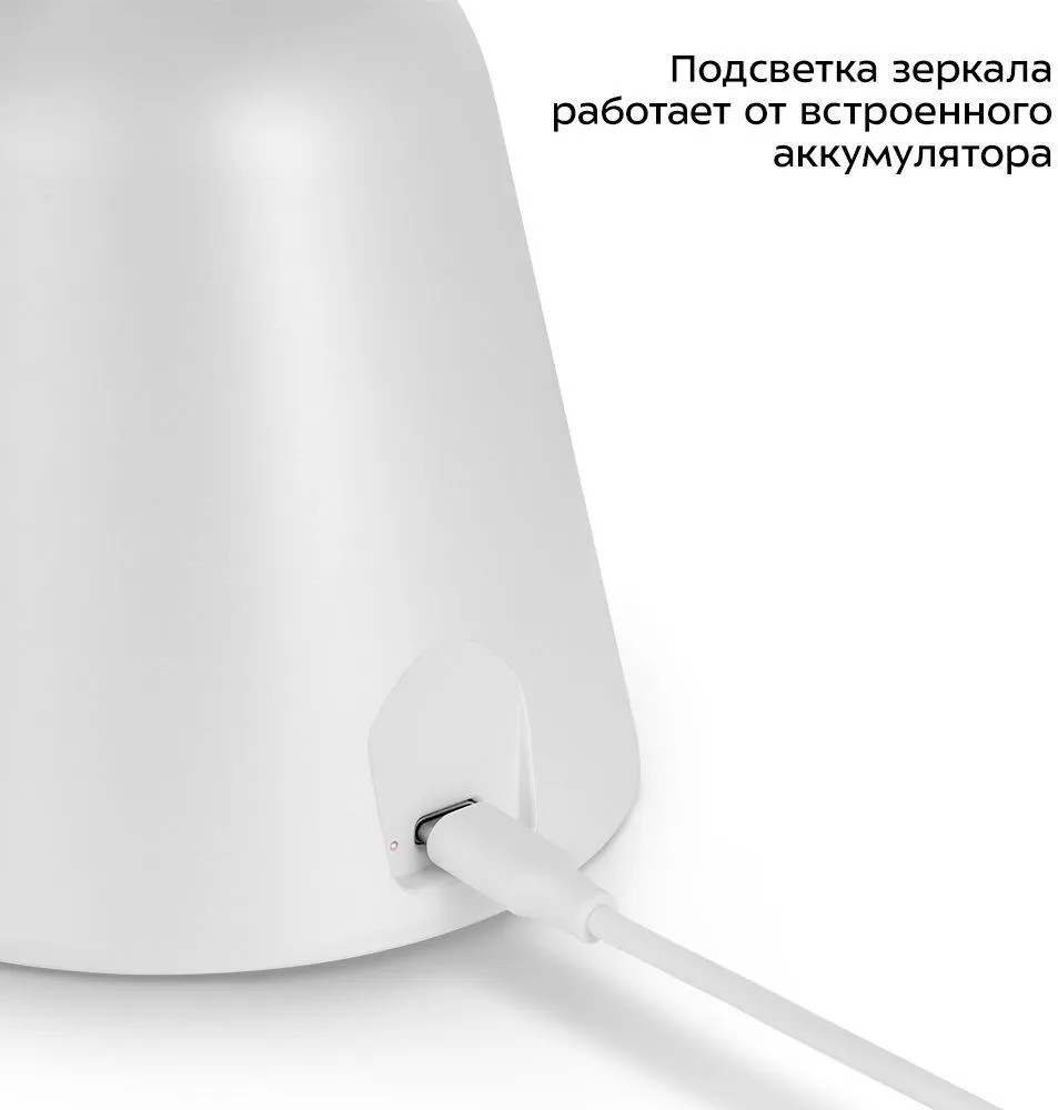 Подсветка зеркала работает от встроенного аккумулятора. Это позволяет пользоваться зеркалом и включать подсветку в любом удобном месте. Вы можете переключать холодный, нейтральный или тёплый белый свет подсветки, а также регулировать её яркость.