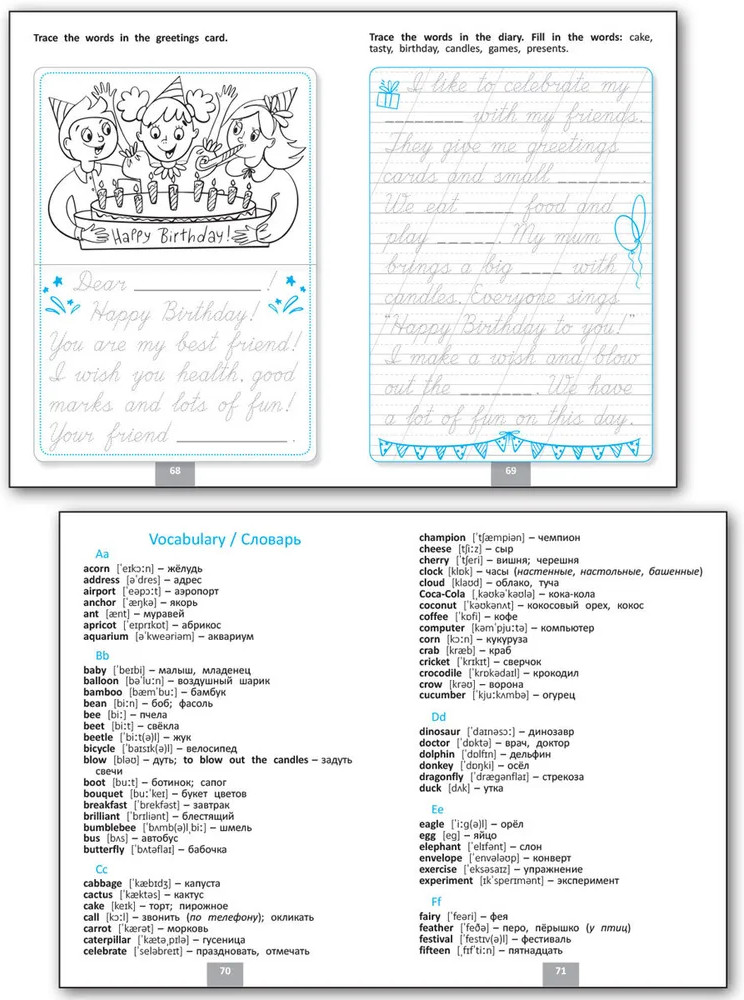 💳 Оплатить за товар можно при получении 🇰🇿 Есть бесплатная доставка по Казахстану от 1 дня 🎁 Копите бонусы с каждой покупки Серия: Рабочие тетради Занимаясь по этому тренажёру, дети научатся правильно и аккуратно писать английские буквы и слова курсивом. Предложены различные задания на закрепление навыков курсивного письма: вставить буквы в слова, написать рядом такое же слово, написать названия предметов, изображённых на рисунках, обвести небольшие тексты, вставить нужные слова в предложения, подписать открытку, написать объявление. Пособие будет полезно при обучении по любым учебникам английского языка, включённым в действующий федеральный перечень. |