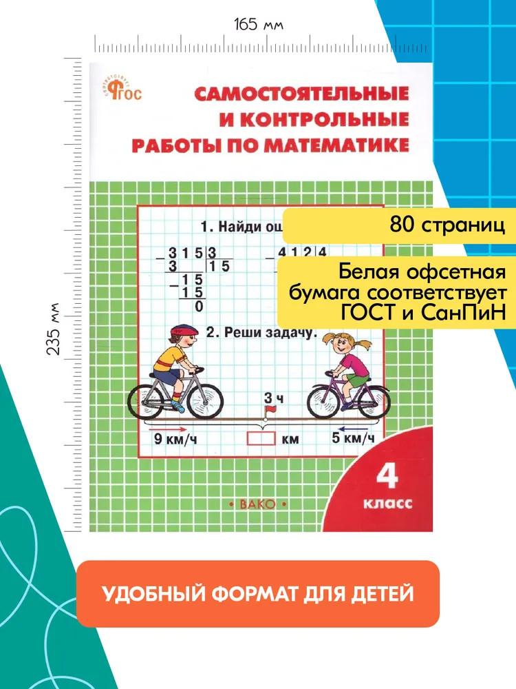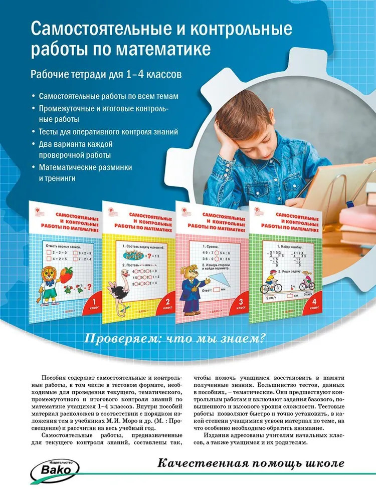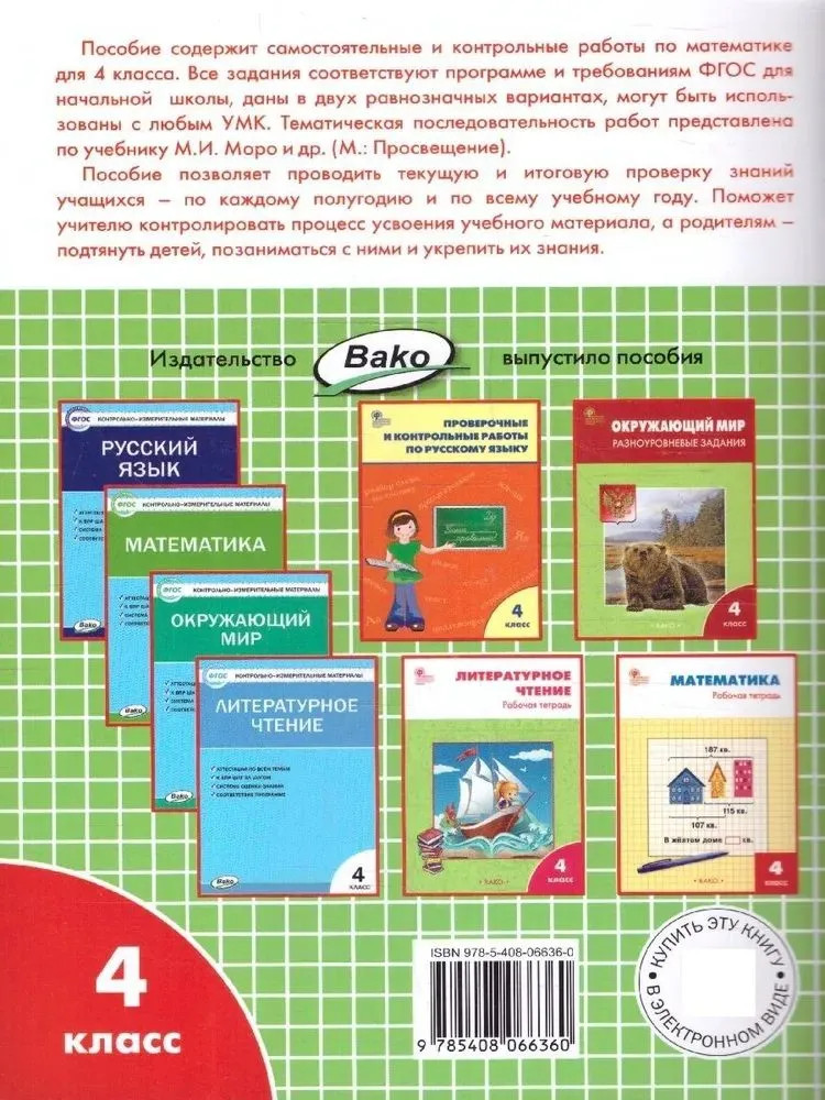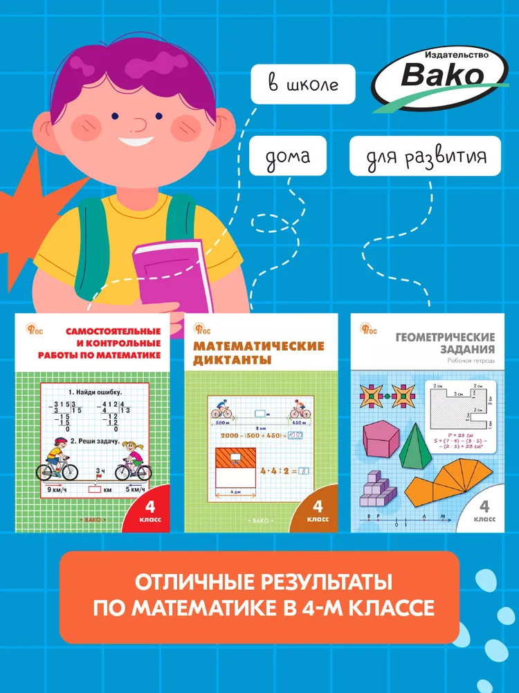 Самостоятельные и контрольные работы по математике. 4 классВ данный момент этот товар отсутствует в продаже. Возможно, у нас найдется аналогичный или похожий товар здесь. Серия: Рабочие тетради Пособие содержит самостоятельные и контрольные работы, тесты по математике для 4 класса. Все задания соответствуют программе общеобразовательной школы и требованиям действующего ФГОС для начальной школы, даны в двух равнозначных вариантах. Позволяет проводить текущую и итоговую проверку знаний учащихся — по каждому полугодию и по всему учебному году. Предназначается учителям начальных классов, а также учащимся и их родителям. |