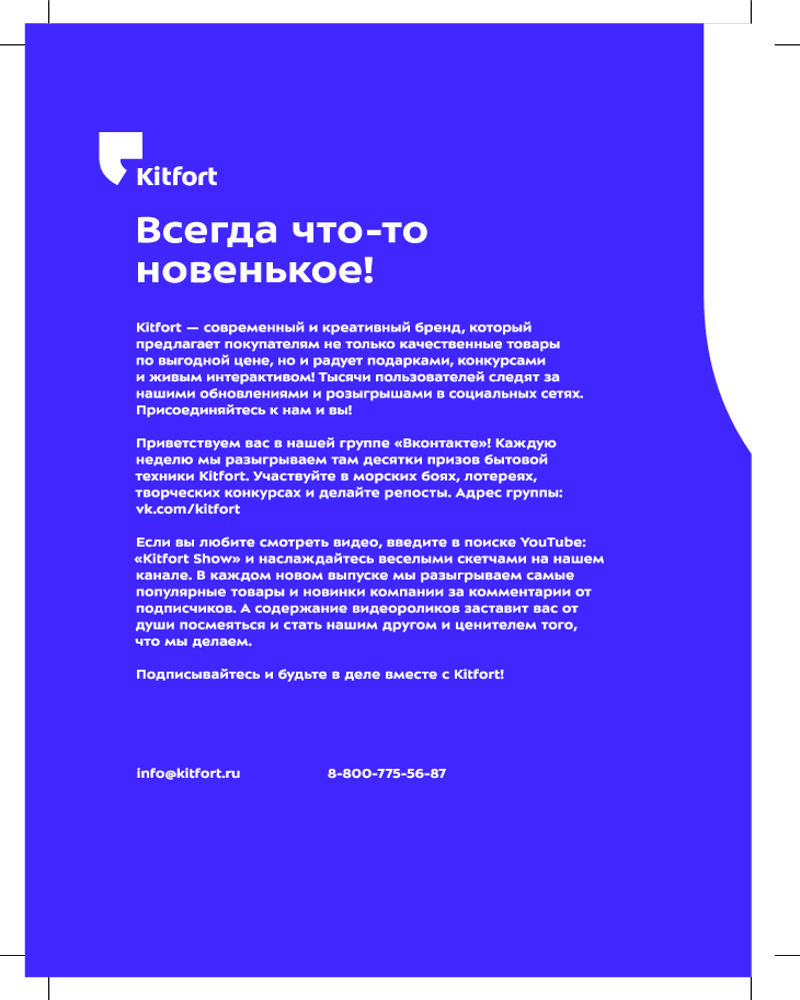 Российский бренд Kitfort занимает лидирующие позиции на рынке бытовой техники для кухни и дома. Основанная в 2011 году в городе Санкт-Петербурге, компания Kitfort стремится предоставить своим клиентам передовые технологии и инновационные решения для повседневных задач и создания комфортного пространства в доме. Компания активно исследует рынок и собирает обратную связь, чтобы предлагать продукты, которые наилучшим образом соответствуют ожиданиям и желаниям потребителей. Каждое изделие...