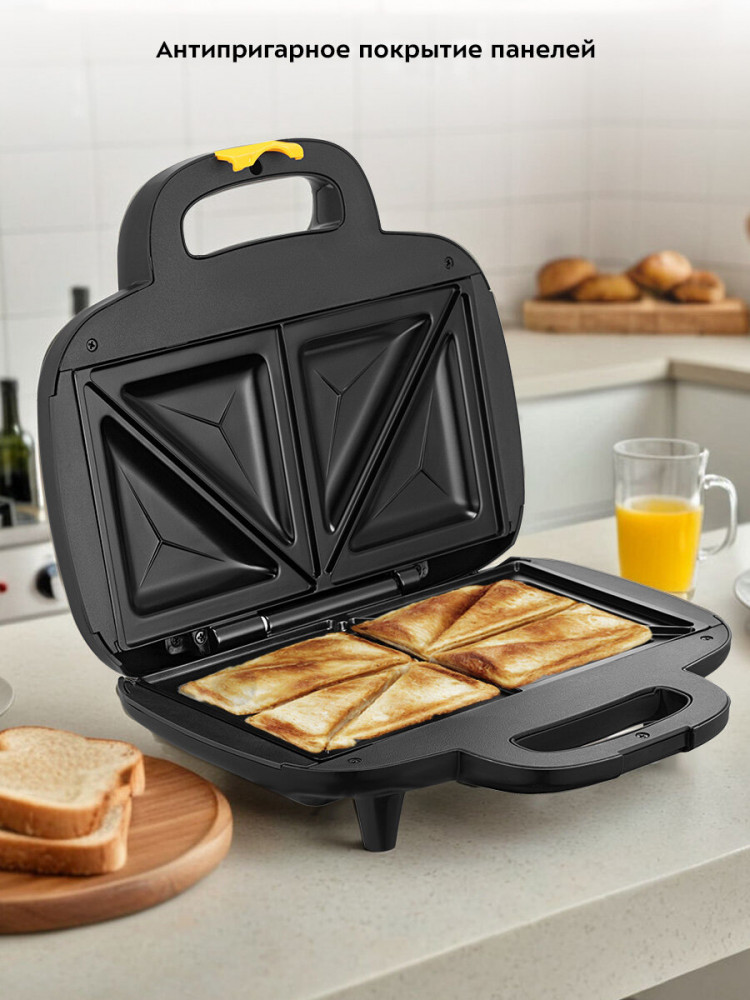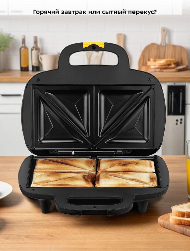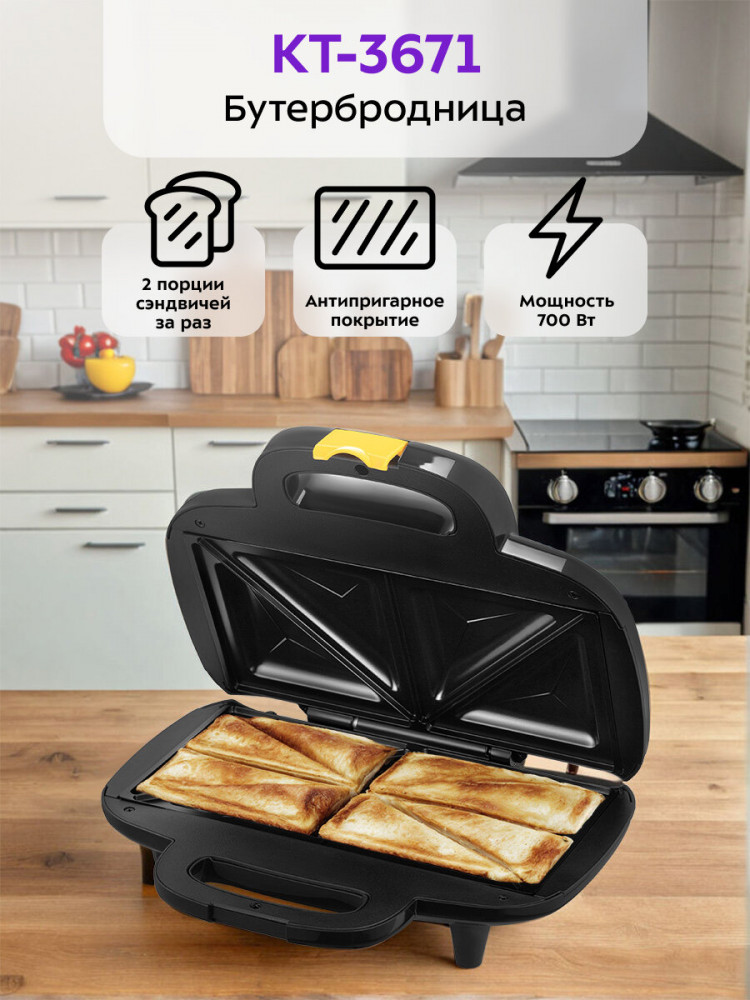 Электрическая бутербродница КТ-3671 поможет приготовить самые разнообразные бутерброды. Можно приготовить не только привычные сэндвичи, но и пирожки из слоеного теста с разными начинками, драники и многое другое. КТ-3671 рассчитана на 2 порции.