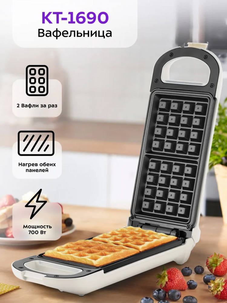 Используя электрическую вафельницу Kitfort КТ-1690, вы сможете приготовить невероятно вкусные, толстые бельгийские вафли всего за несколько минут! Она поджаривает вафли сразу с двух сторон и с помощью индикаторов показывает, когда панели готовы к работе.