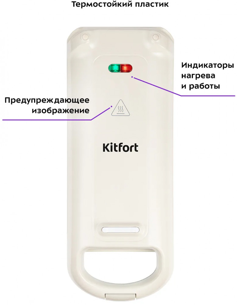 Электрическая вафельница Kitfort КТ-1690 имеет корпус, выполненный из прочного термоустойчивого пластика. На верхней поверхности вафельницы нанесено изображение с предупреждением о высокой температуре, чтобы избежать возможных ожогов.