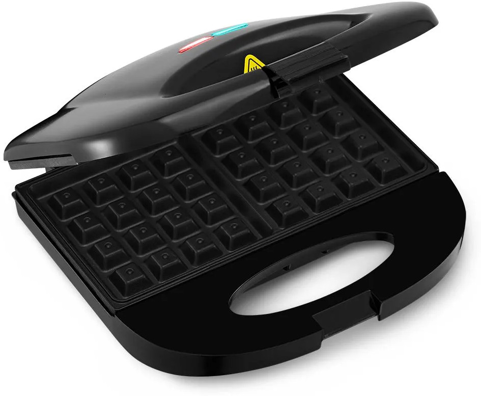 Электрическая вафельница имеет корпус, выполненный из прочного термоустойчивого пластика. В вафельнице установлены нагреватели в каждой половине. Прорезиненные ножки не дают прибору скользить по столу во время готовки.