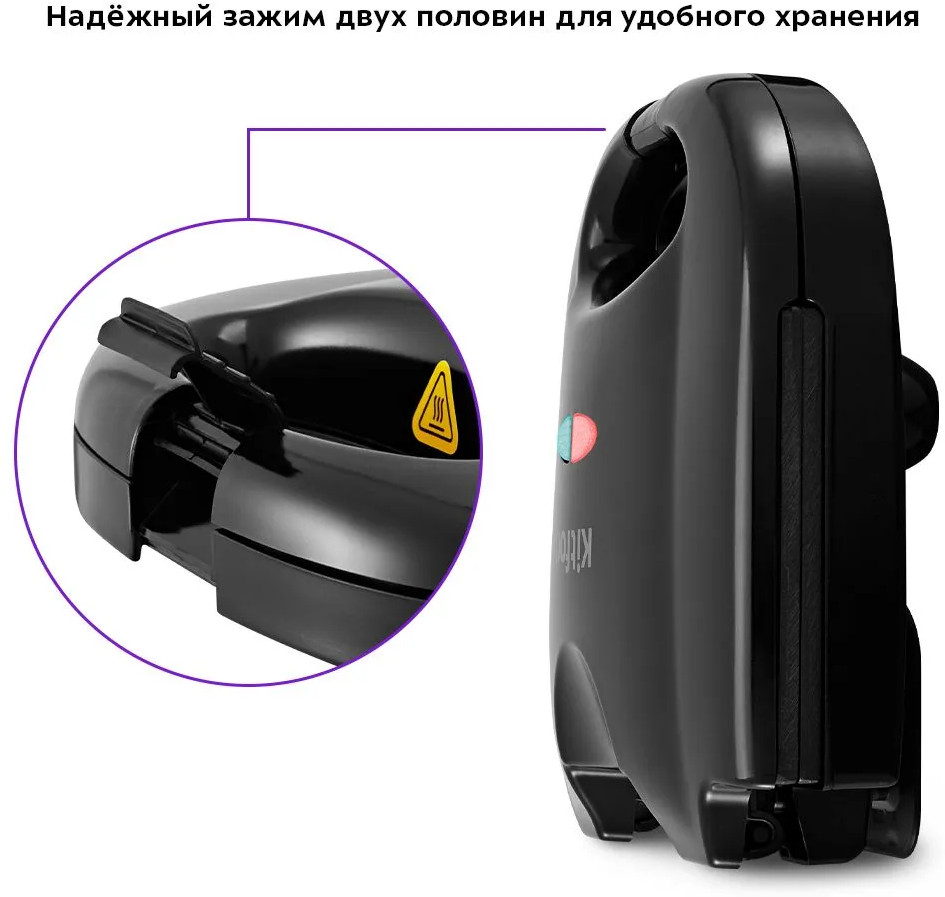 Зажим вафельницы не только обеспечивает идеальное приготовление вафель, но и служит для удобного хранения вафельницы. Также вафельница оснащена противоскользящими ножками, которые предотвращают её скольжение по столу во время приготовления.