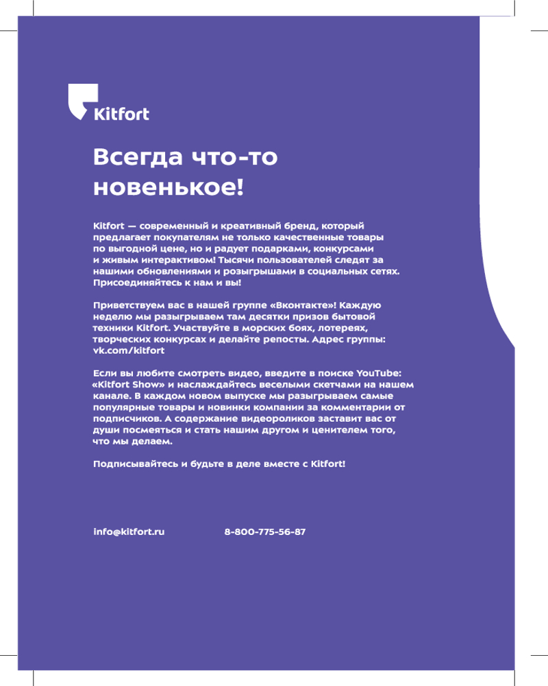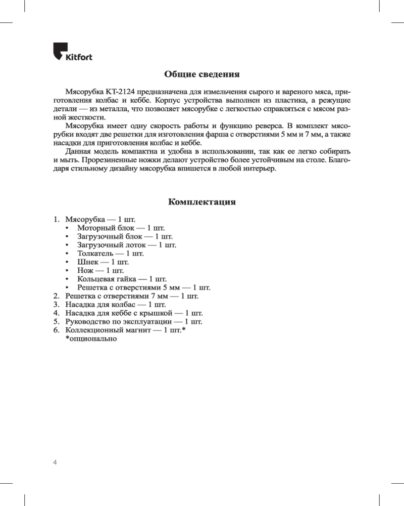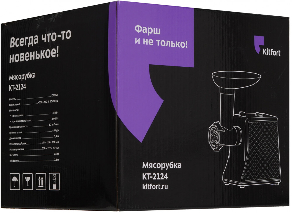 В данный момент этот товар отсутствует в продаже. Возможно, у нас найдется аналогичный или похожий товар здесь. Мясорубка Kitfort КТ-2124 оснащена мощным мотором 800 Вт, что обеспечивает производительность 1,2 кг фарша в минуту! Корпус устройства выполнен из пластика.
