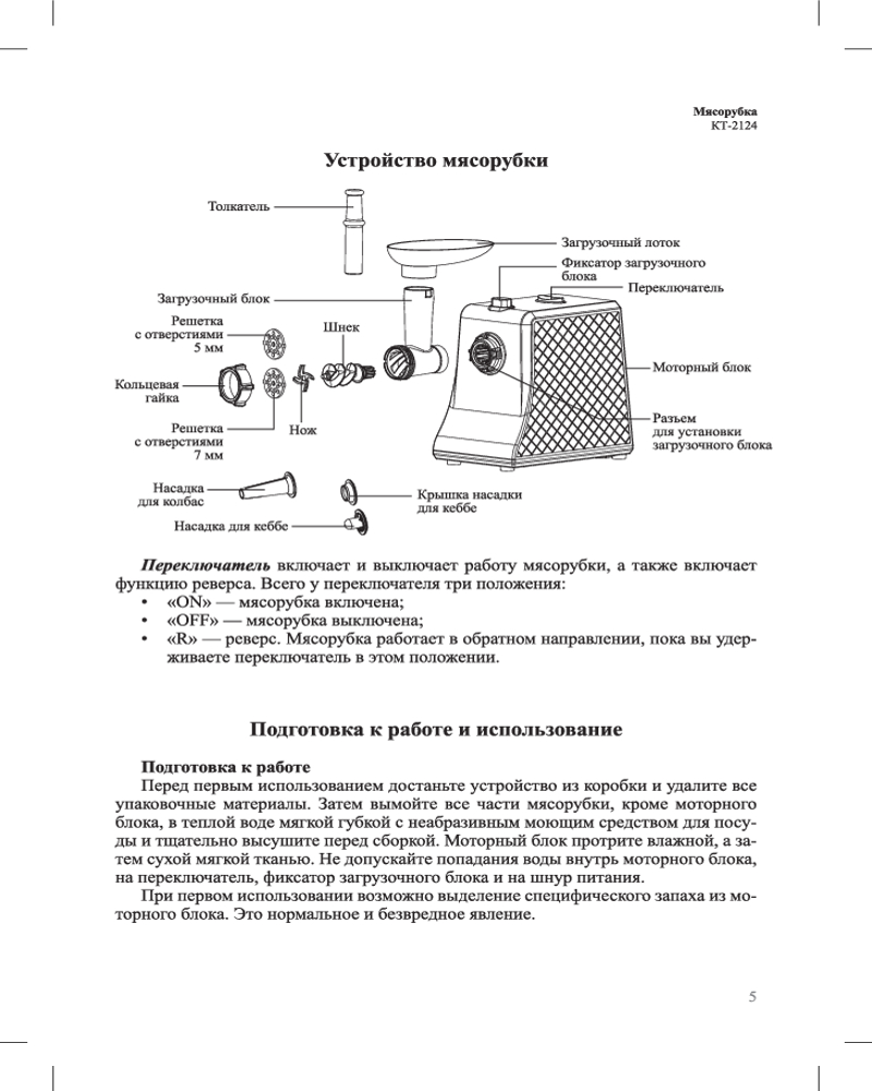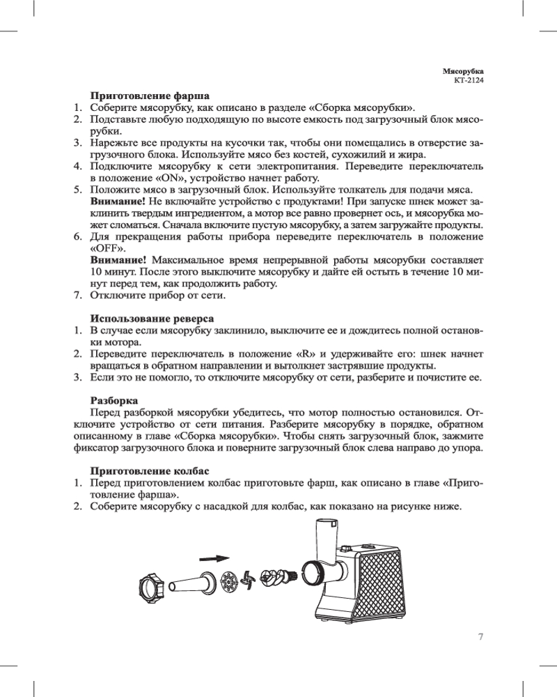 Прибор имеет одну скорость работы. Если вам необходимо удалить застрявшие в мясорубке куски мяса и жилы, не нужно разбирать мясорубку, достаточно лишь просто включить реверс.