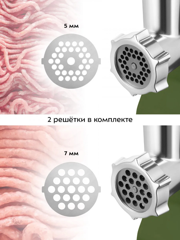 В комплект входят решётки для фарша различного диаметра, которые позволят сделать как котлеты и бифштексы, так и нежнейшие фрикадельки, например, для детского питания.