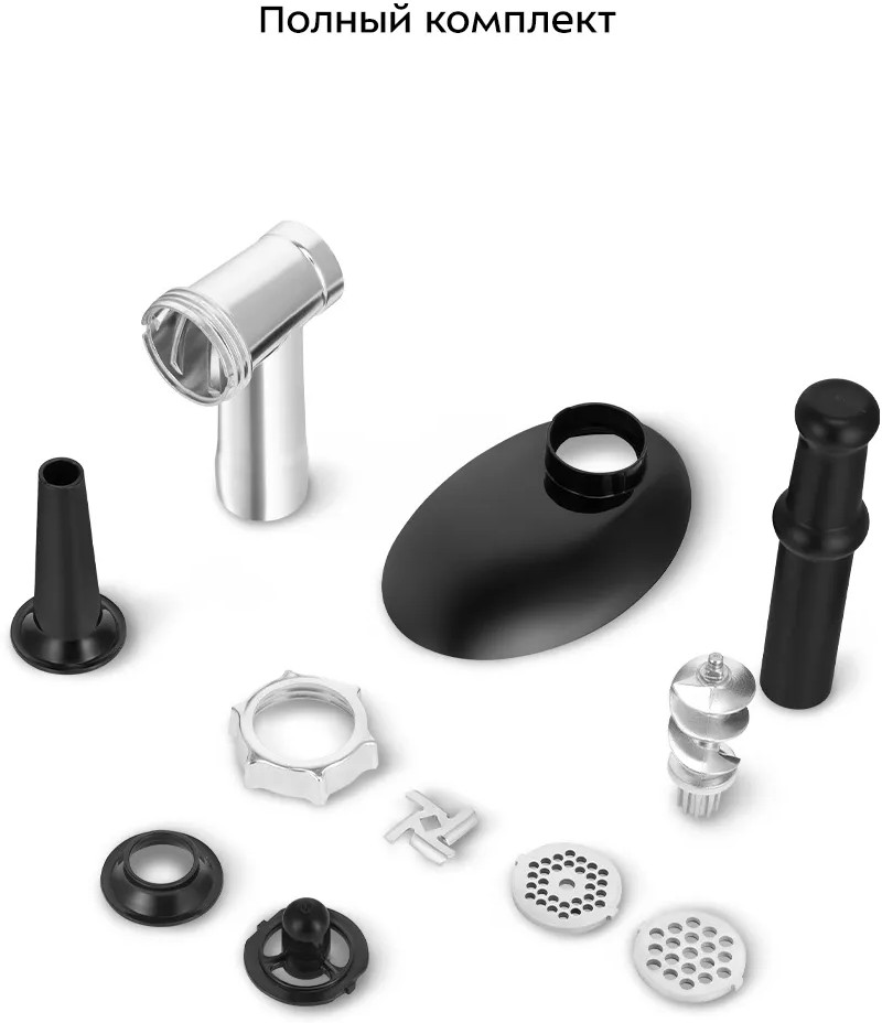 Помимо насадок решёток в комплекте идут толкатель, кольцевая гайка, загрузочный блок и лоток, шнек и другое.