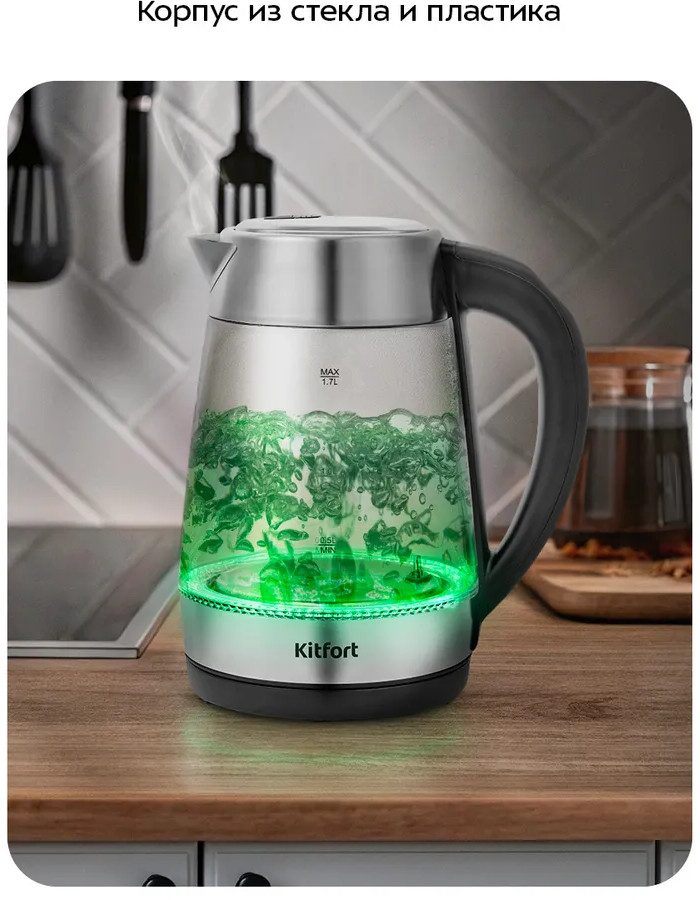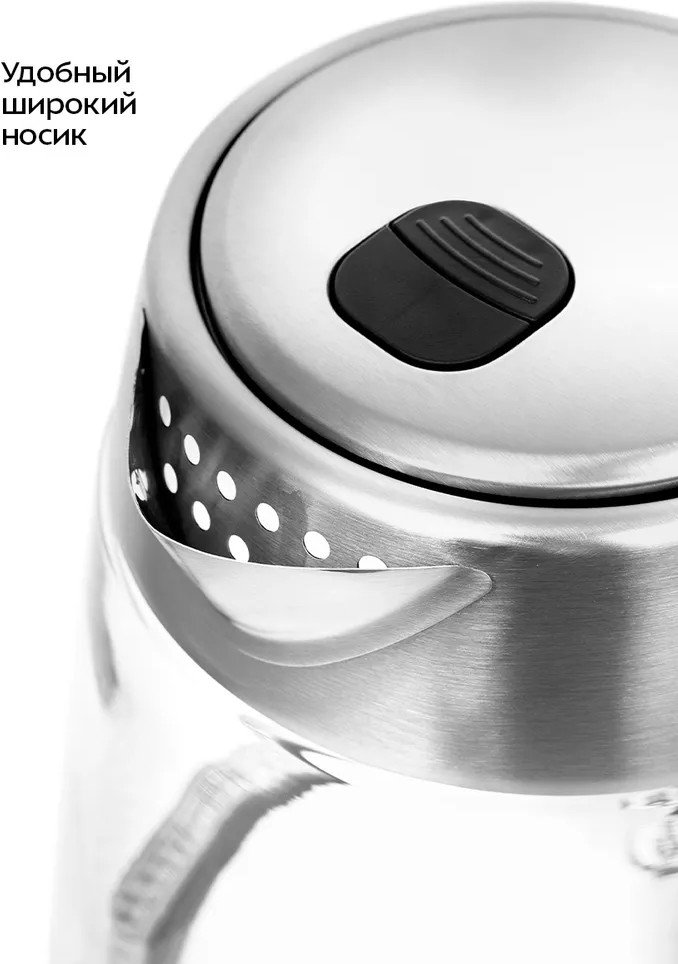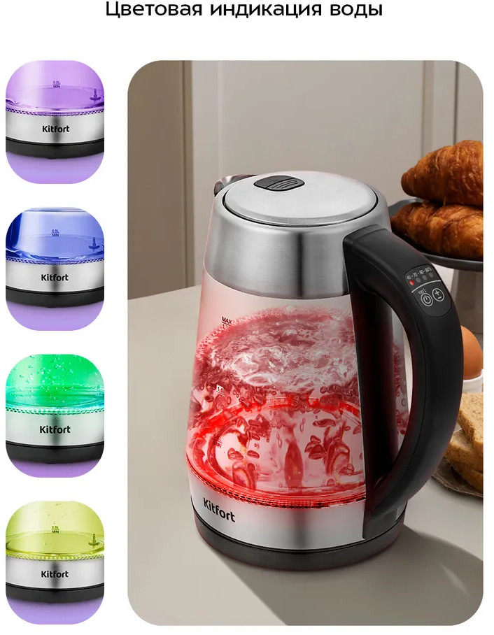 💳 Оплатить за товар можно при получении 🇰🇿 Есть бесплатная доставка по Казахстану от 1 дня 🎁 Копите бонусы с каждой покупки Чайник Kitfort КТ-6107 выполнен из сочетания трёх материалов — стекла, пластика и нержавеющей стали. Мерная шкала нанесена на прозрачную часть корпуса. Для вашего удобства на ручке расположена панель управления чайником. Благодаря широкому носику вы можете наливать напиток без риска разлива или разбрызгивания, а также наполнять чайник через удобный широкий носик. Чайник оснащён терморегулятором и может нагреть воду от 40 до 100 °С, что очень удобно при заваривании различных сортов чая, приготовлении кофе и подогрева детского питания. Чайник также оснащён функцией поддержания температуры до 2 часов. При включении чайника по периметру дна загорается подсветка, которая является индикатором работы и одновременно художественно подсвечивает воду разными цветами. |